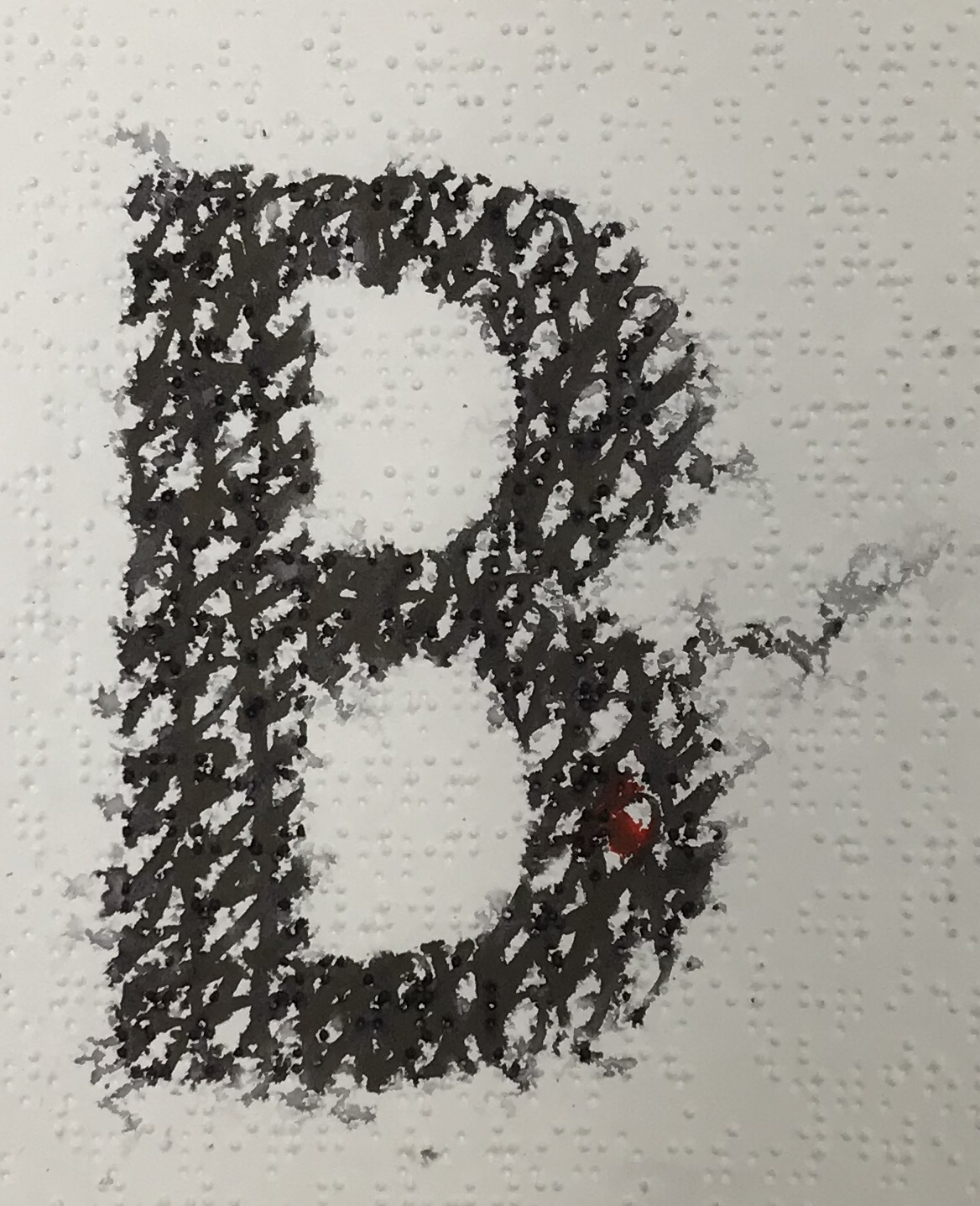 This is the last week of our fifty week calligraphy challenge. The prompt was to choose one letter, then using only black on white paper with a small dot of red, write the letter at least twenty-five times to create a design. I chose the letter B and wrote it using Sumi ink on a Braille bible page. I connected over sixty ‘B’s to design the shape of the letter, then spritzed it with water to smear the ink. I like the way the water moved outside the ‘lines’ and onto the page.