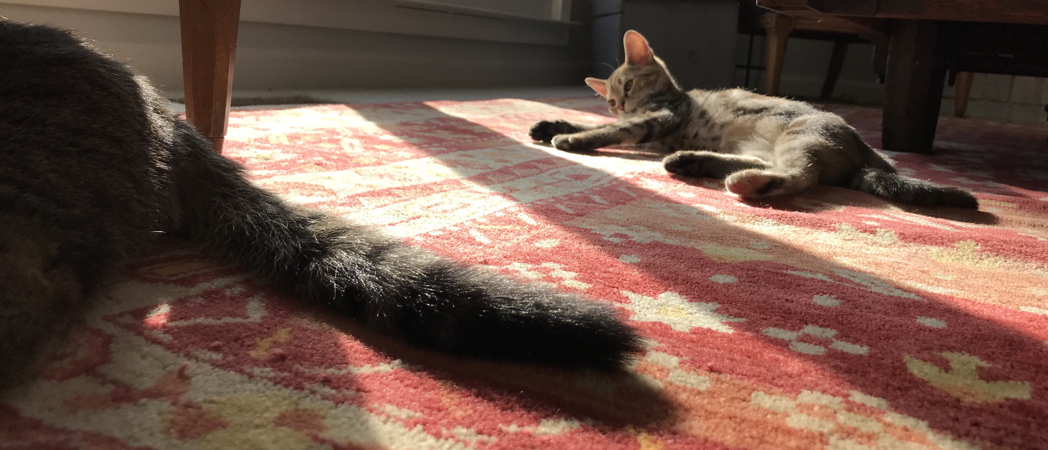Our kitten and cat are becoming better friends. Today they enjoyed time in the sun just being warm. The older one gets a bit annoyed at the energy level of the kitten, and yet he wrestles and grooms her until she gets distracted and finds somewhere else to pounce.