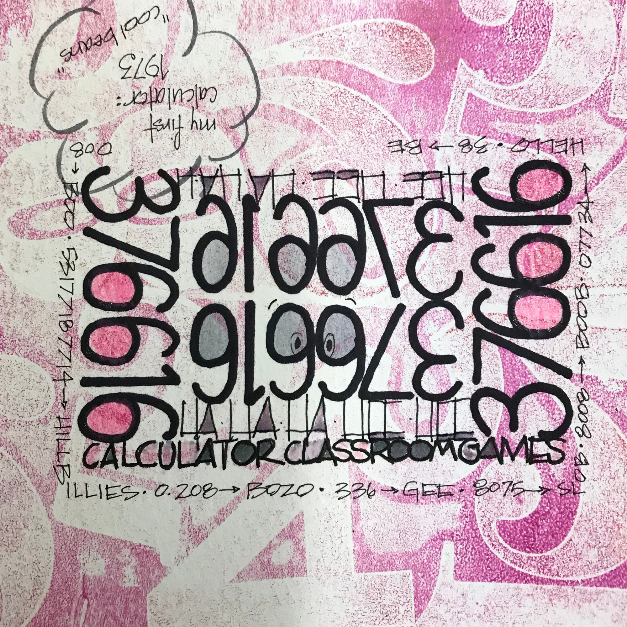 It’s the third week of our year long calligraphy group and this week’s prompt was reading with numbers. The idea was to exchange numbers for letters and spell words or a phrase that could still be legible. Once I read the prompt all I could think about was using my first calculator in Mr Greenlee’s Math class to make words. This memory made me giggle, so I created this version using the numbers 376616, which on an upside down calculator spells the word giggle. I used a gel printed background then added Sharpie and Copic markers, colored pencils and some generic marker. Around the edge I wrote other ‘words’ you can spell on an upside down calculator.
