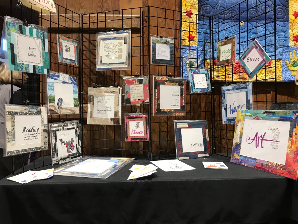 The final gathering at the John C Campbell Folk School is Student Recognition, sometimes called Show & Share, or Happy Clappy. All the classes that took part during the session show the end results of what they learned. Here you see the table for my class. We had enough space for each student to show two to three pieces. The lower right hand corner is the group project we created during the week. AMAZING work considering everyone was a beginner and had little or not experience with calligraphy, layout or design.