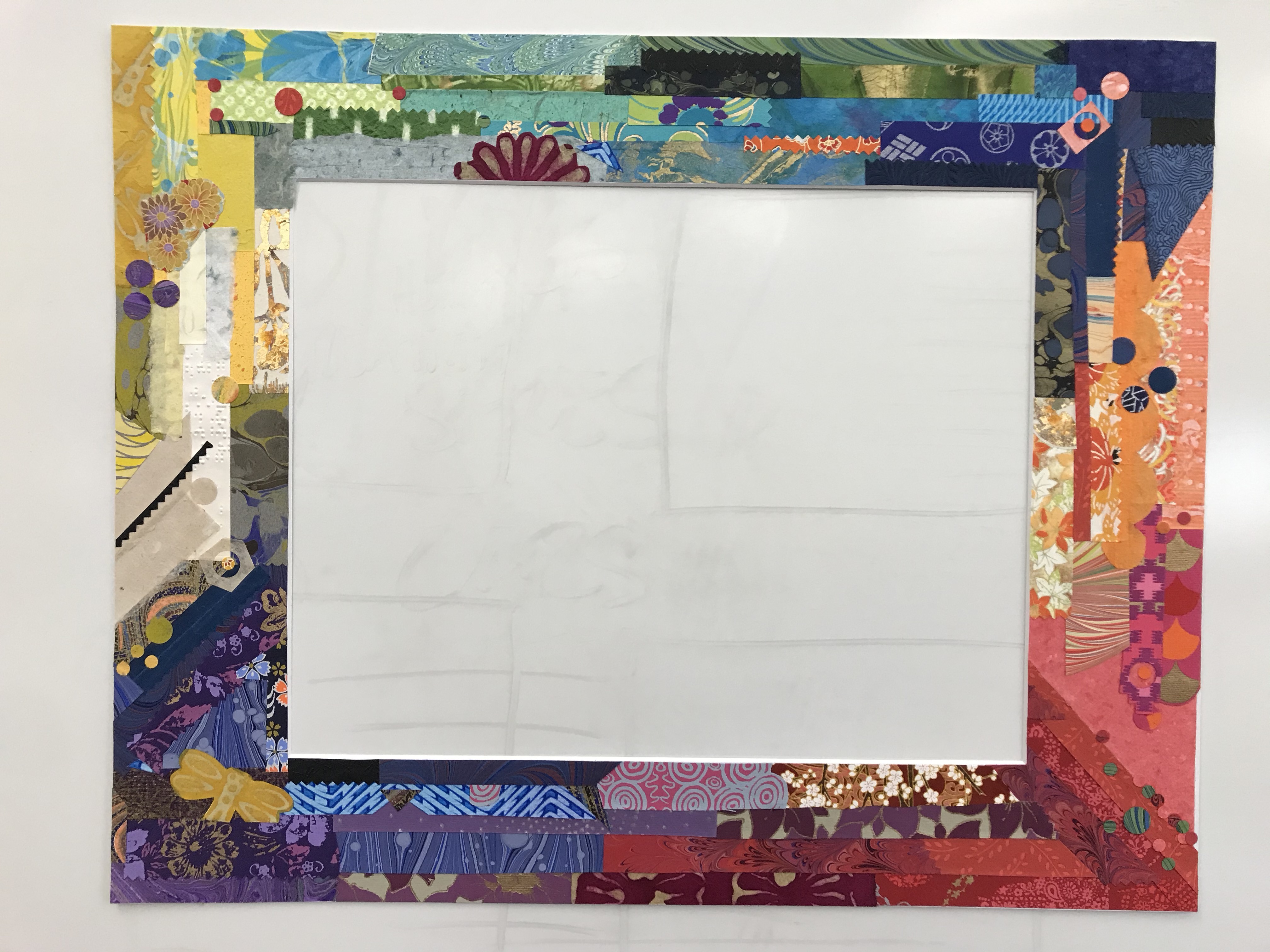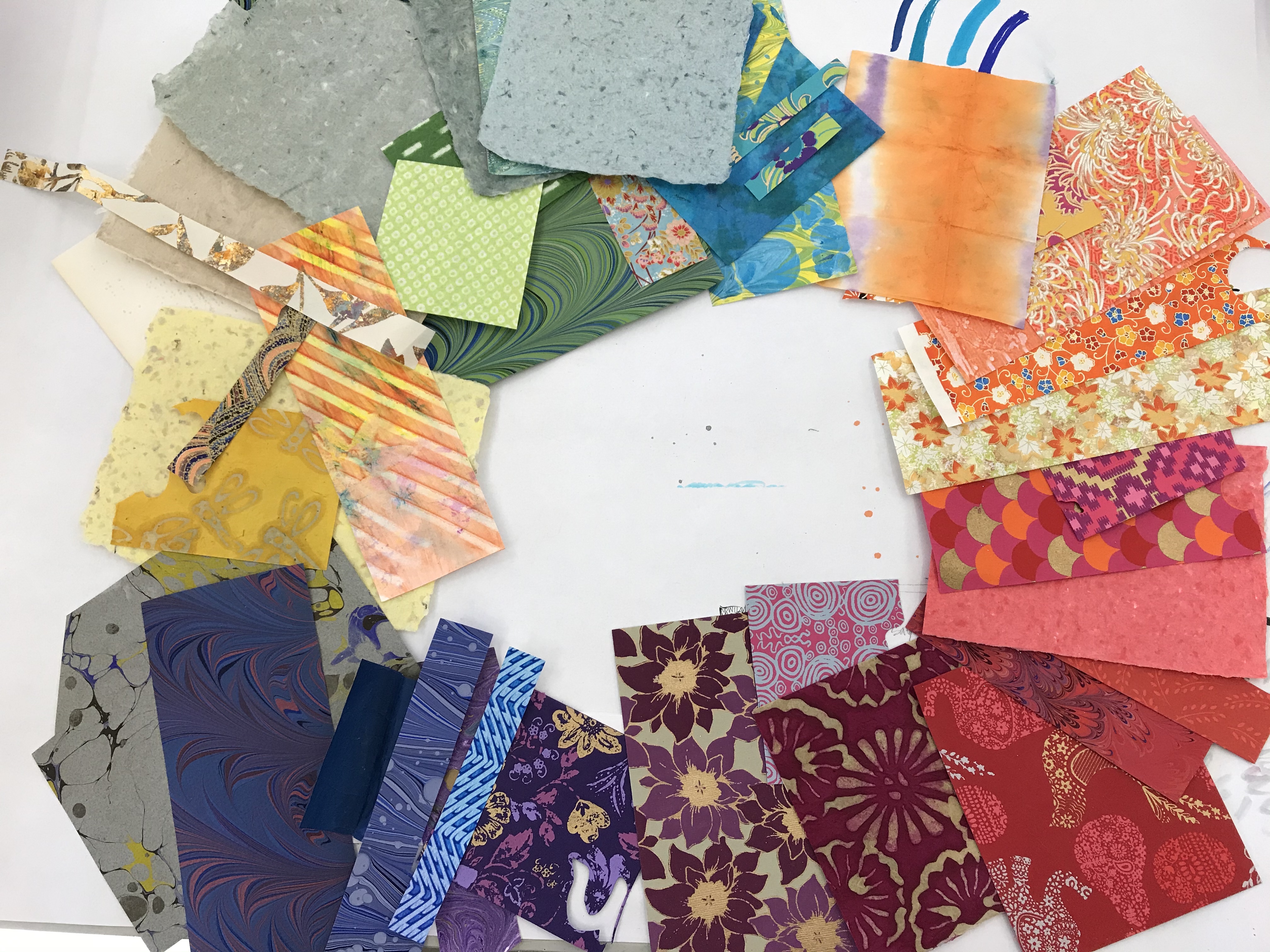 During my week of teaching at the John C. Campbell School, we studied design and layout. As a class we worked together on a project, each student selecting papers and layout options. The top photo shows the final draft. The lower left photo shows the papers gathered by the group, the lower right shows the mat once it was completed.