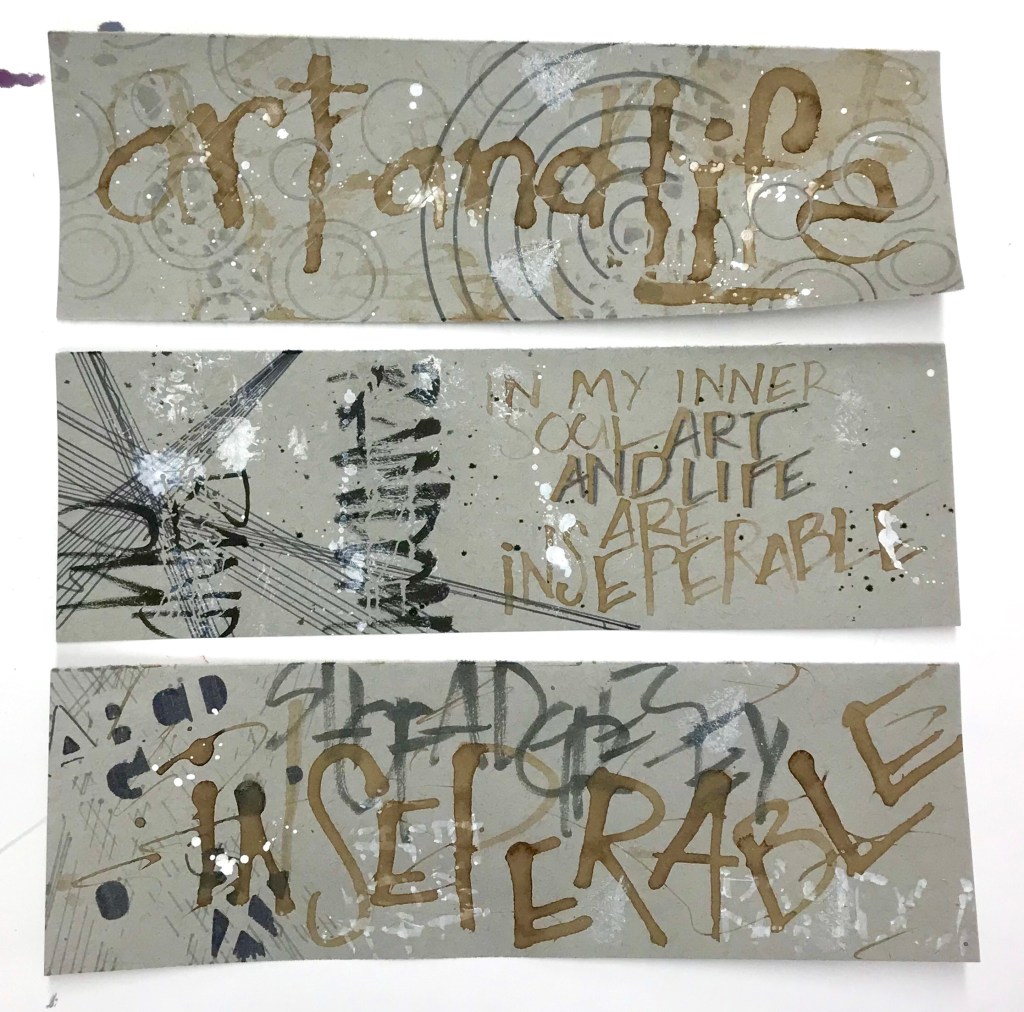 The eighth prompt in our calligraphy group was to create something inspired by Eva Hesse. I had never heard of her as an artist so my Google search yielded words like random, texture, and unconventional. I took those words to heart and wrote one of her quotes in three different ways. I prepared the three pieces of paper by adding resist, textural lines, circles, stamps and other random marks. I splattered and ‘flicked’ inks to add more texture. I let them dry then moved forward in writing the main quote.