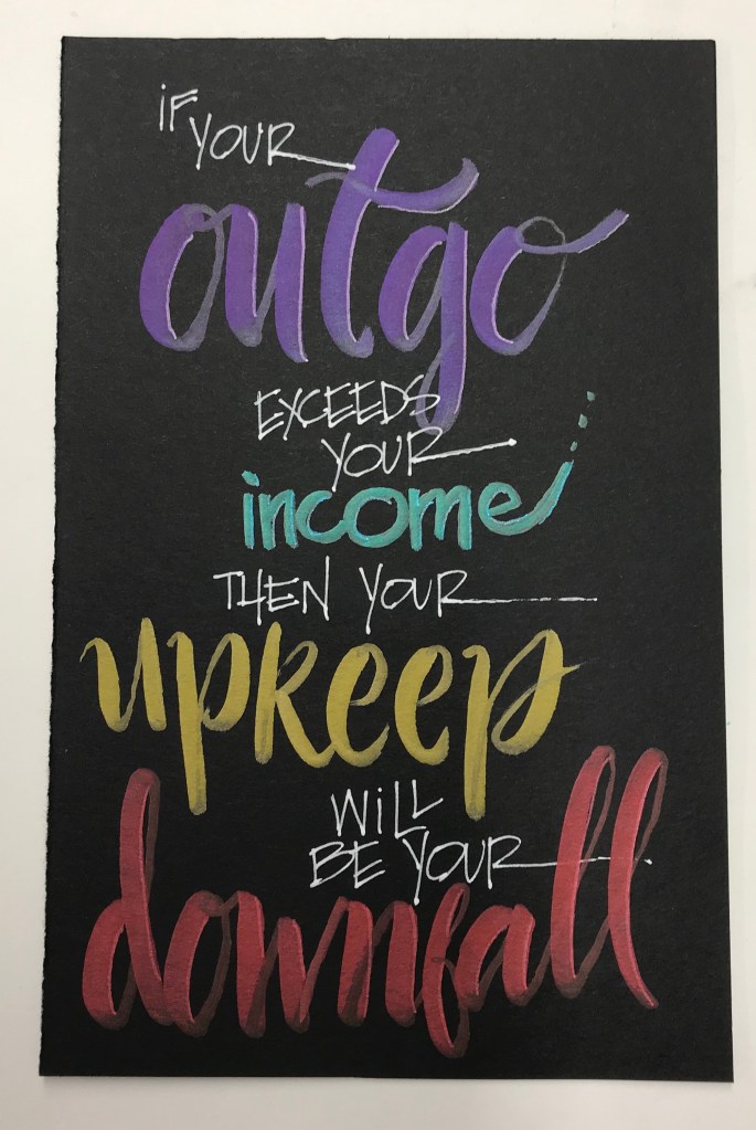 There are two certainties in life – death and taxes. In this country we have the privilege of paying our fair share. Not everyone sees it that way. Other countries do it differently and they too have their own set of financial problems. As you buy something today think about what you are spending. Think long and hard. Is that item or event worth the time it will take you to pay it off, or are you able to simplify everything and just pay cash? There is a reason why the ancillary saying for this quote is, “Cash is King”. Don’t let your upkeep be your downfall.