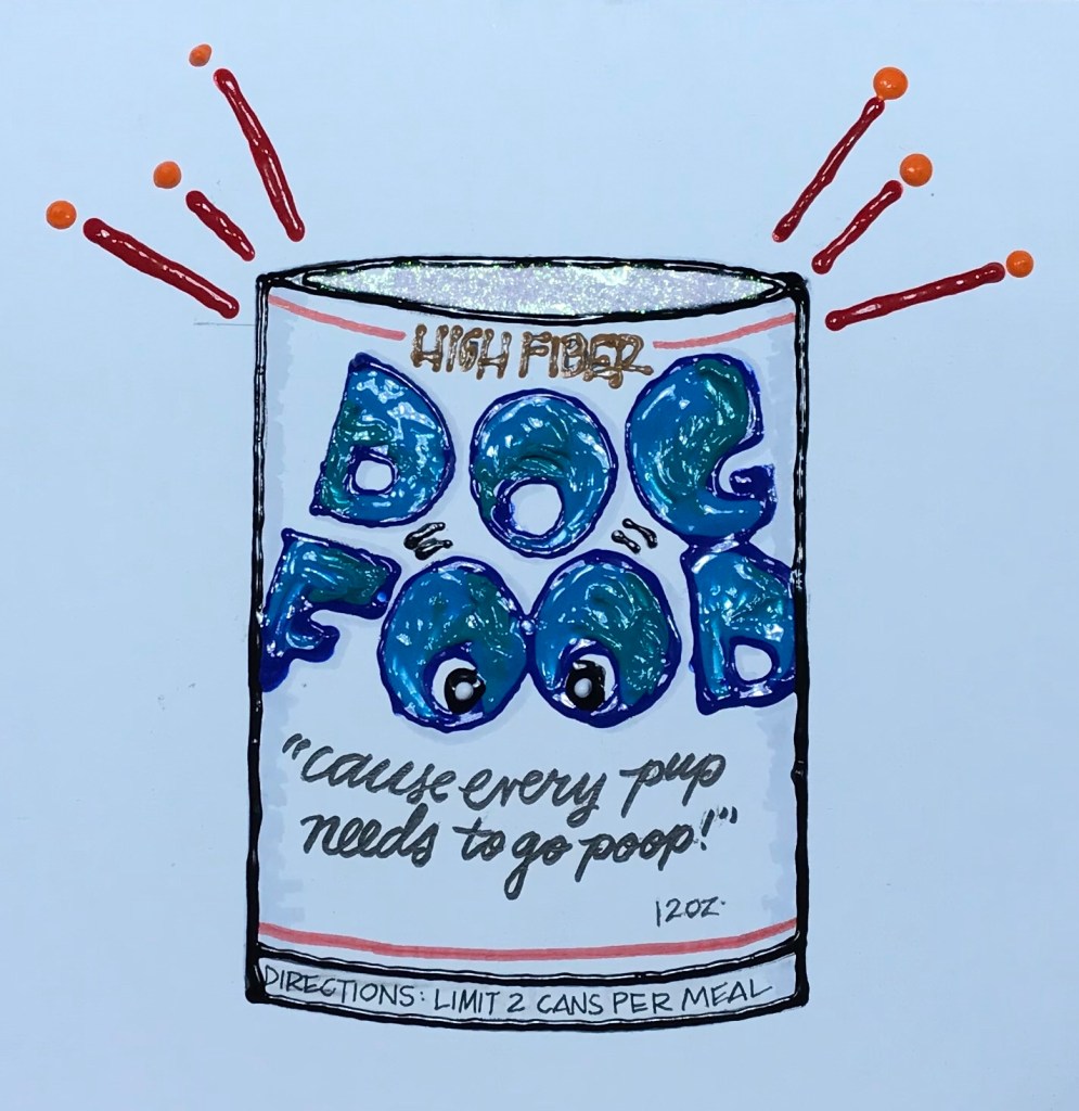 Earlier this week Biscuit, our seventeen month old puppy, was having a little trouble. She had not gone to the bathroom for three days. Even though Labradors are known as ‘garbage guts’ we knew there was something wrong. After two visits to the vet, two x-rays and five cans of high fiber dog food she finally went potty, outside thankfully. The new concept for me this week was high fiber dog food, I never knew there was such a thing, so I created this homage to it. If I had only known about this product I could have saved us two trips and two x-rays. At least now I know.