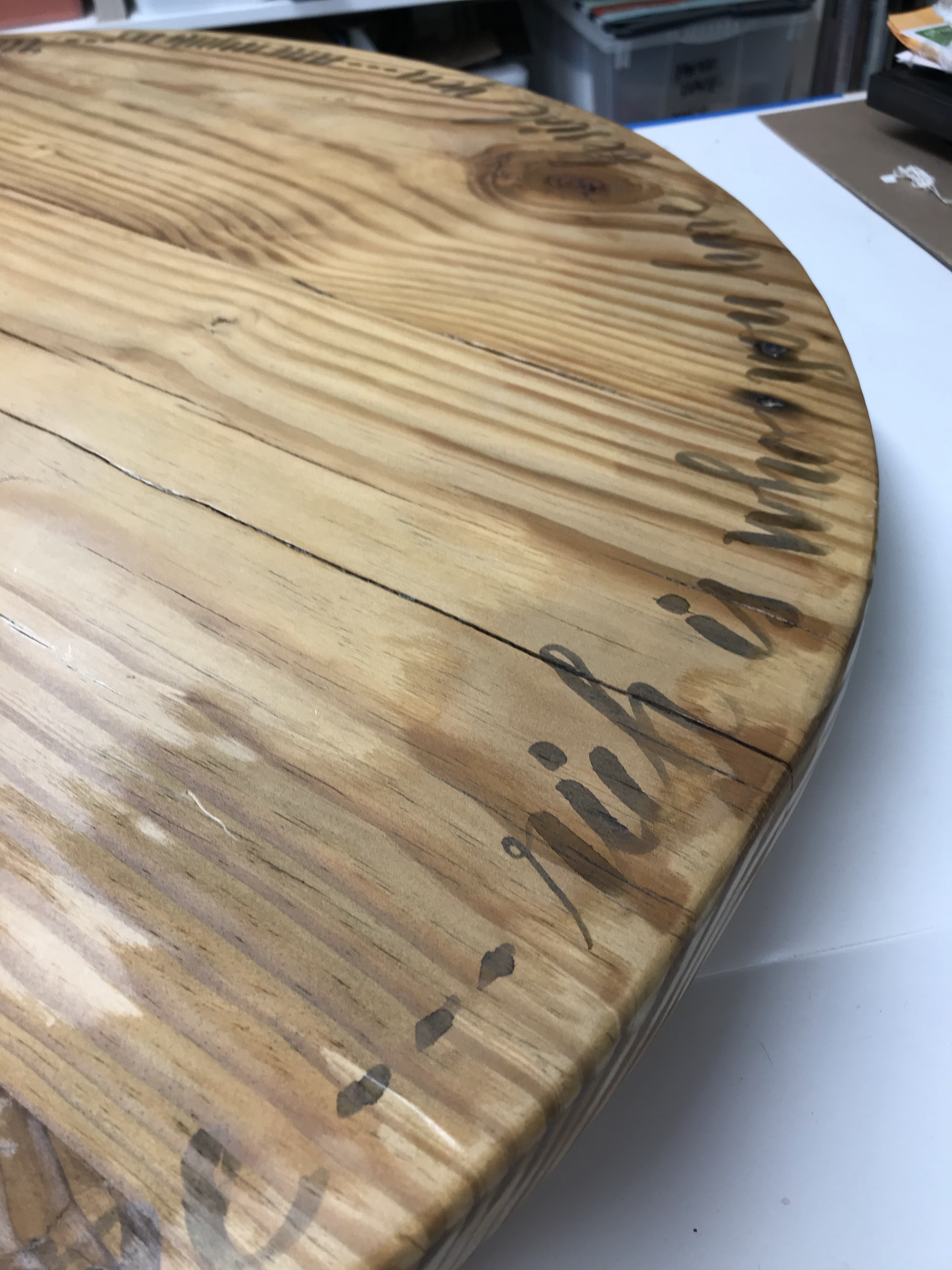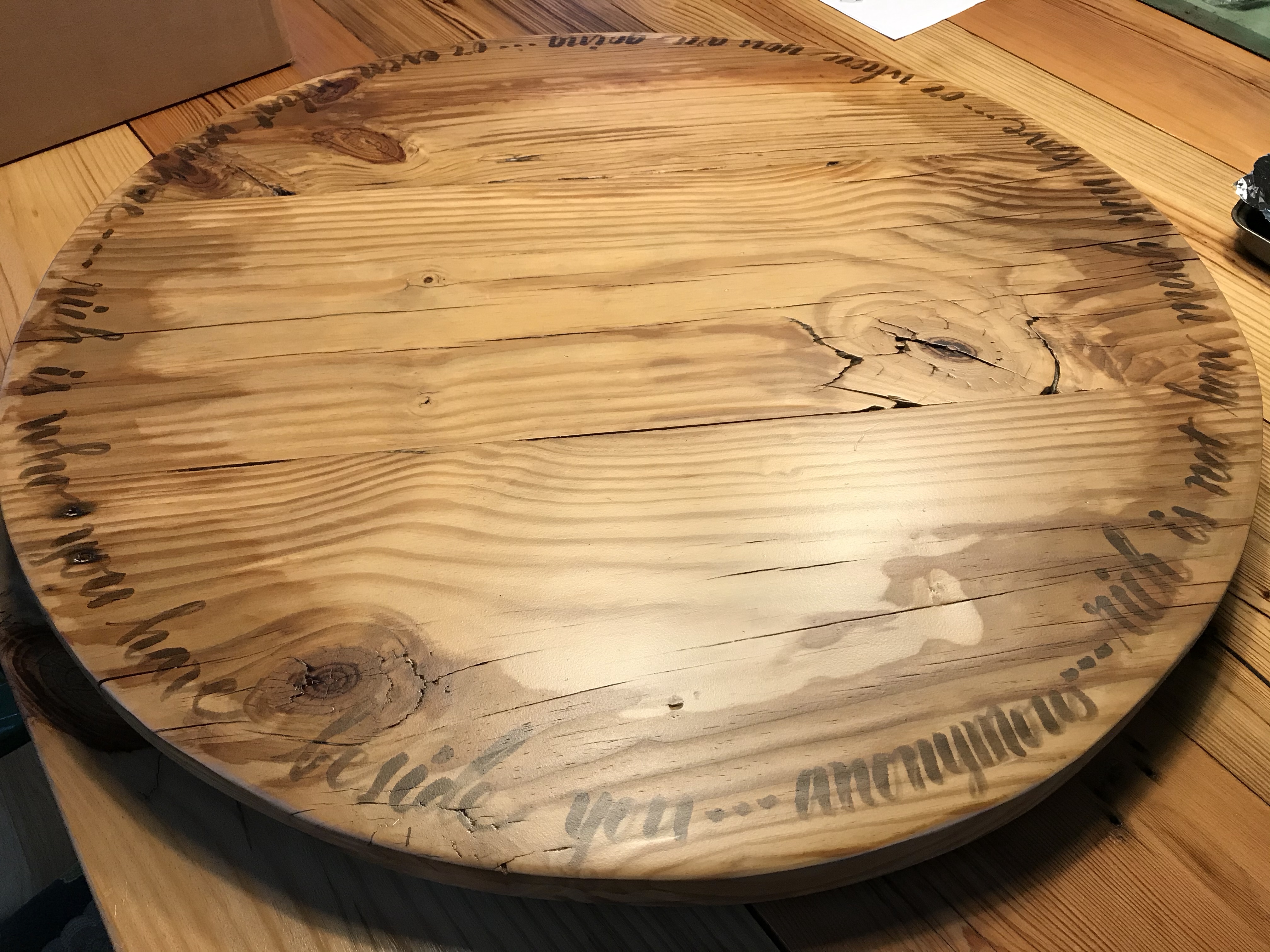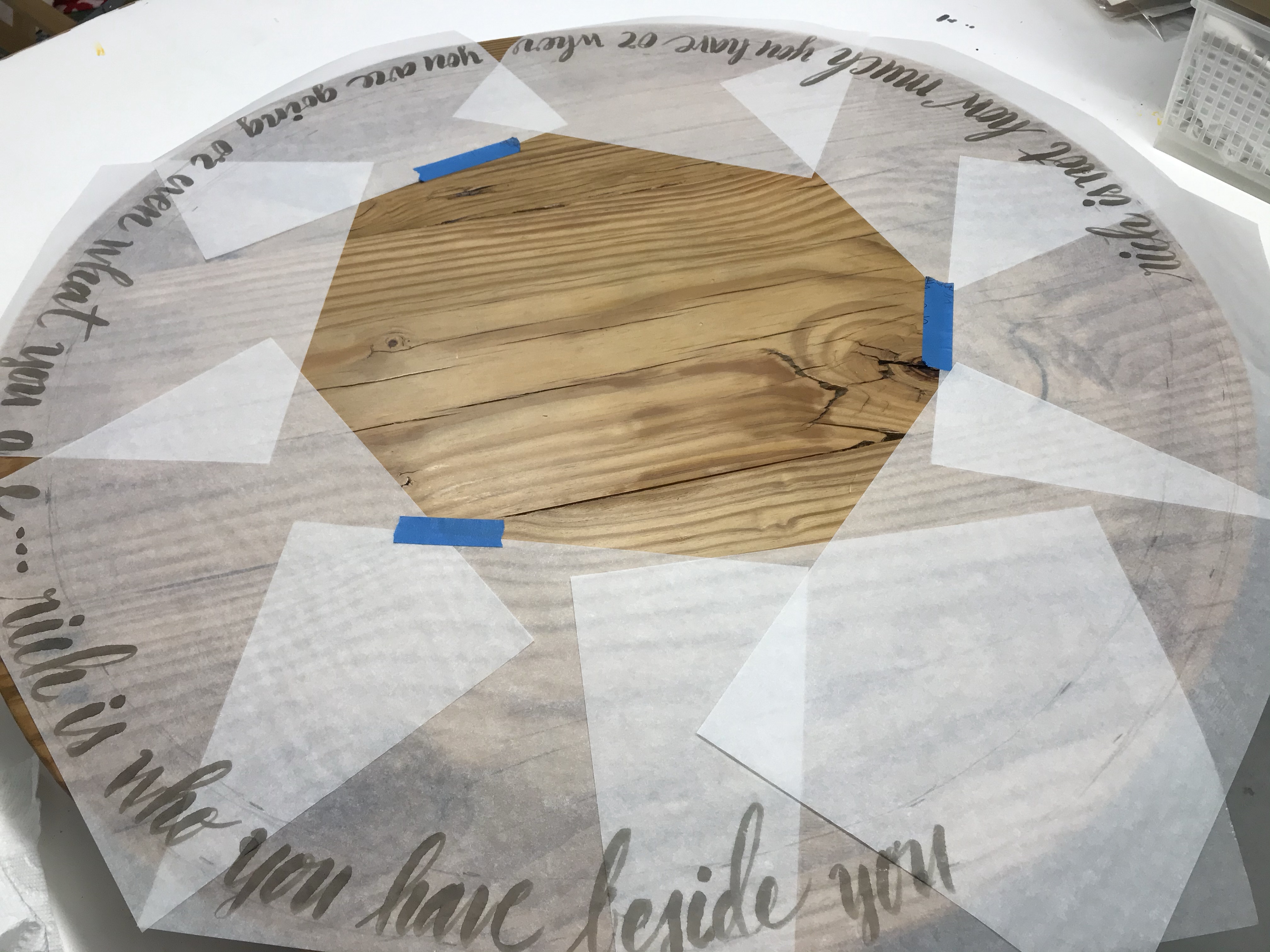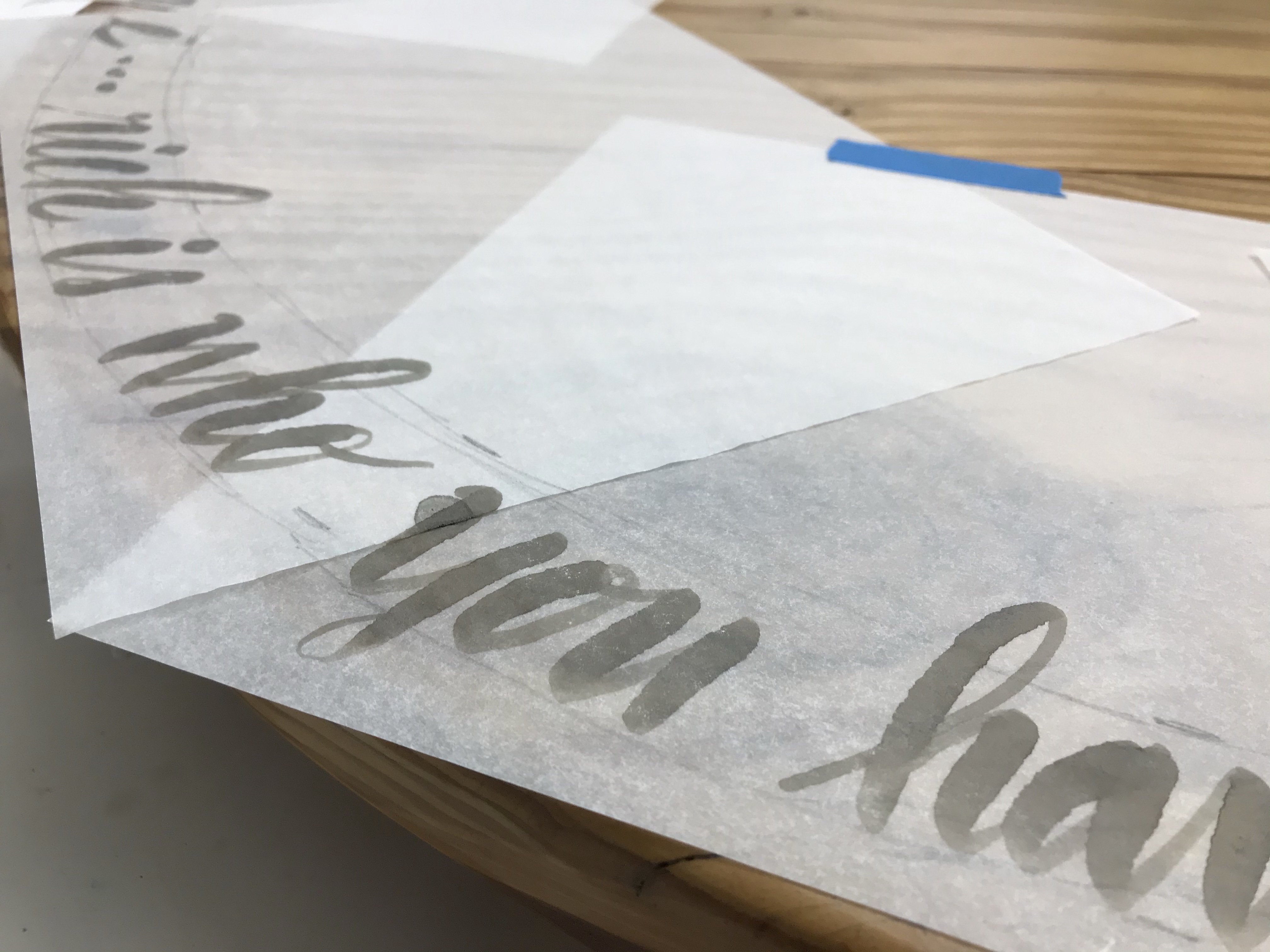My Dad made our kitchen table over fifteen years ago. He also made a lazy Susan from the same wood that gladly serves all our delicious meals. I calligraphied the lazy Susan and over the years the letters faded from the sun. To begin I sanded the finish off. I then covered it with tracing paper to aid in the layout process. Last time I wrote lines on the wood to allow me to be consistent and even, those lines left indentations in the wood so I did not make that mistake again. I drew pencil lines on the tracing paper then tested various inks on the underside to see what color would work best. I decided to use a dark grey as it looks almost brown on the wood.