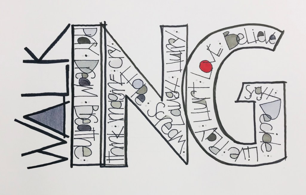 We are in week thirteen of our fifty week calligraphy challenge and the topic this week was walking. Anything that we were inspired to create around the topic. I looked for poems, sayings and quotes about walking and then took a long walk. While on that walk lots of topics crossed my mind, so instead of creating a piece about walking I decided to focus on all the things that happen while walking. All those things end in ING, hence the words enclosed in the letters ING. It was my husband’s idea to use red on the word love, nice touch I think.
