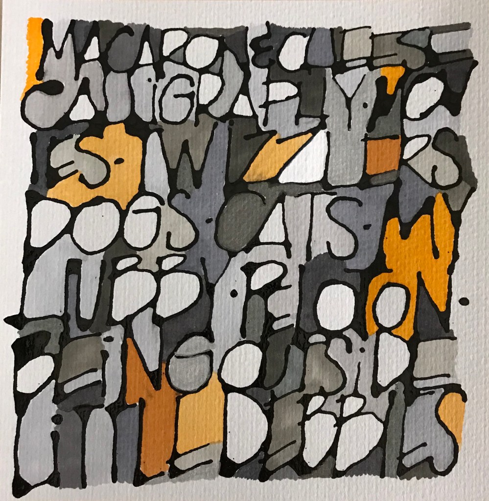 For week eighteen of our calligraphy challenge we were asked to do something with words of comfort. The first thing I thought of was macaroni and cheese, but how do you do that in calligraphy? I pondered a bit then thought of more things that are bringing me comfort so I decided to make a collage inspired piece. I used Sumi ink and applied it via a needle tipped applicator, then filled in the negative space outside the letters with various markers. I am very pleased with the way it turned out.