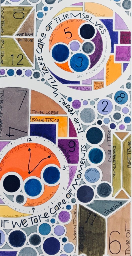 I spent several hours in my studio working on this one. I was actually waiting for someone to arrive and they were four hours late. Instead of getting mad I utilized the time working and adding layers. Maybe it was because I was writing the word ‘time’ so many times that I never felt cramped or stressed. One of the benefits of being a Calligrapher is that you get to focus on wonderful words for hours on end. Eventually they sink into your soul. Once I put the last tool down I realized that I had spent hours creating this and I was not disappointed in any way. I was proud of the way I had managed these moments.