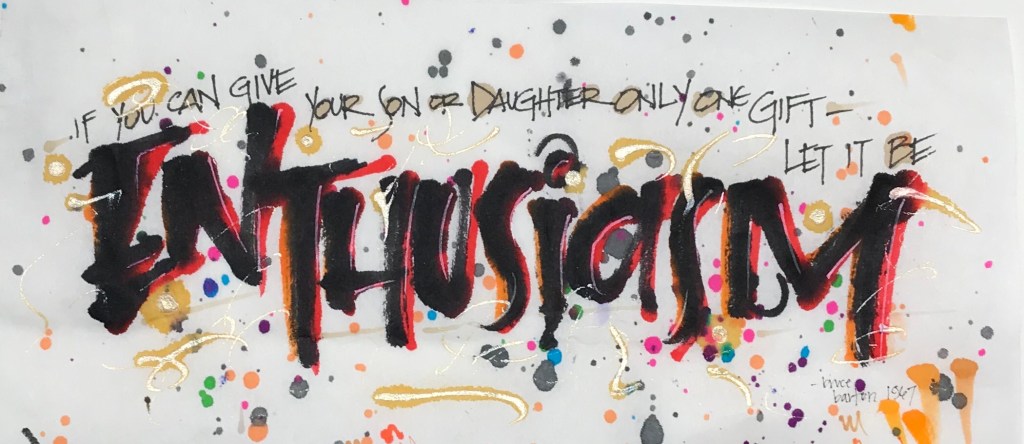 There are so many lessons and gifts a parent can provide and give to their child. I think these words from Bruce Barton are right on the money. Of all the things we can give the next generation enthusiasm is the greatest one of all. If one is enthusiastic everything in life is better, larger, more amazing and full of excitement.
