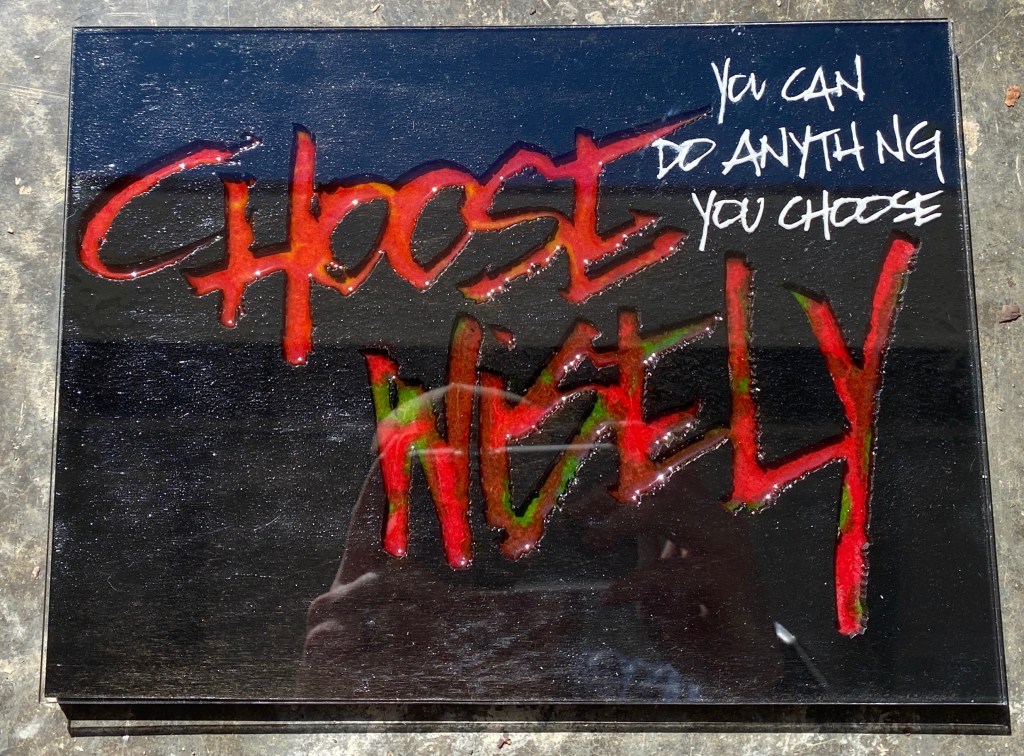 My nephew and his wife bought a new “lathe” which allows them to carve things into wood, metal and acrylic. I sent them an envelope that was decorated with this saying. They scanned my work into their lathe and duplicated it in wood. They sent me this text to show me how it turned out. I was shocked to see my two dimensional work turned into a three dimension piece of art. Technology is incredible!