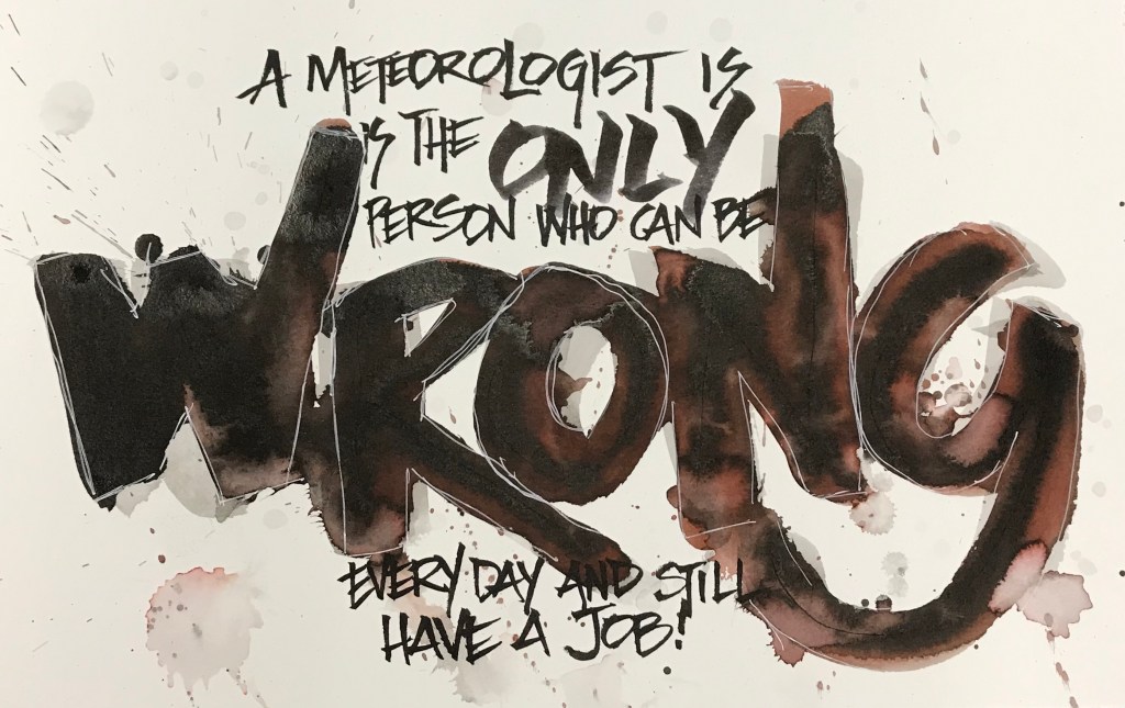 This week’s calligraphy prompt was ‘weather’. Anything to do with it was fine in any format. I do a lot of contemporary work so I wanted to go a little more traditional. I found a beautiful poem about sunshine and rain…then there was a very loud clap of thunder, it started violently raining and I was disgusted. The forecast was for sunshine for three days straight. Out loud, alone in my studio I said this phrase. I knew right then I had to chuck my idea and write the words that came out of my mouth. I say this phrase ALL the time, now I’ve even said it calligraphically.