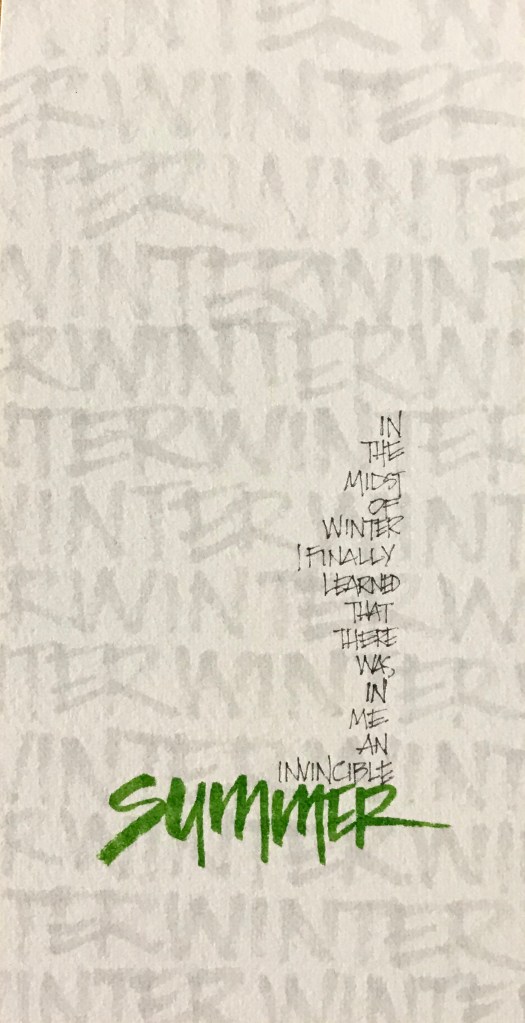 And then I read this quote from Albert Camus, “In the midst of winter I finally learned that there was in me an invincible summer.” What a great reminder that we have within us at all times an INVINCIBLE summer. We have the ability to experience sunshine, daisies, fireflies and popsicles. We have the mental choice to live each day in cold darkness or bright light; it is our attitude and our thought processes that give us this power. With as long as we have been social distancing it is time to turn on our super powers.