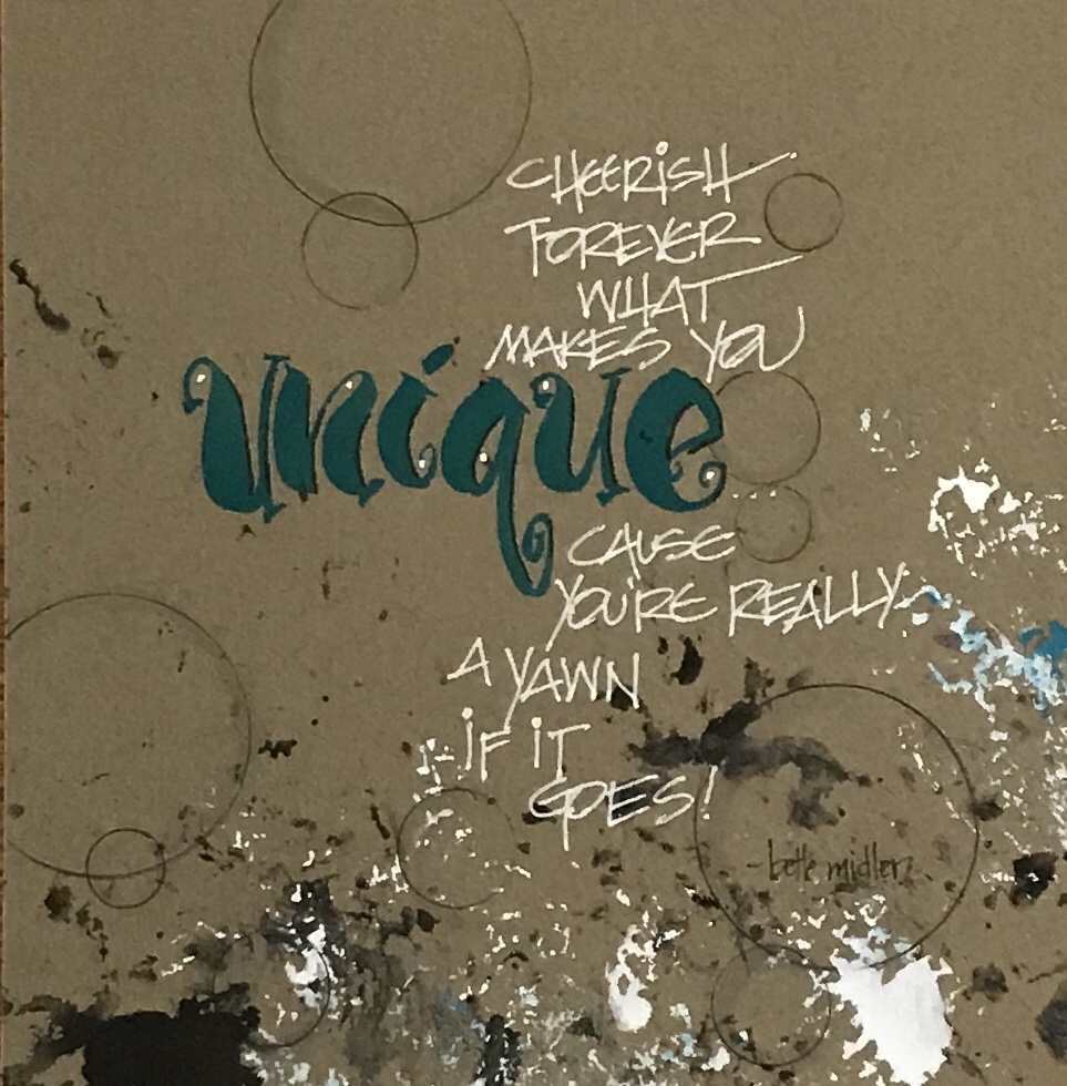 I found this small piece of scrap paper and wondered how to use it. It was a remnant from a larger piece with paint splatters, which left me challenged. When I read this quote from Bette Midler in one of a multitude of my actual quote books I knew what to do with this scrap. The unique paper and quote about being unique needed to work together to sell the idea. I think it works pretty well, I think it brings out the bright side of the word unique.