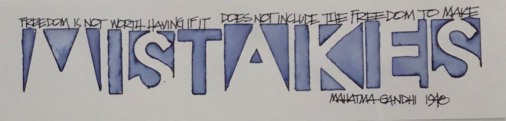 I find it ironic that this piece started from a mistake. I was using a blue fountain pen and smeared the ink all over the page and my hand, I liked the way it looked so much that I built the word ‘mistake’ around smearing ink with water. I very much appreciate Ghandi’s thought process here, freedom includes positive and negative outcomes for us all.