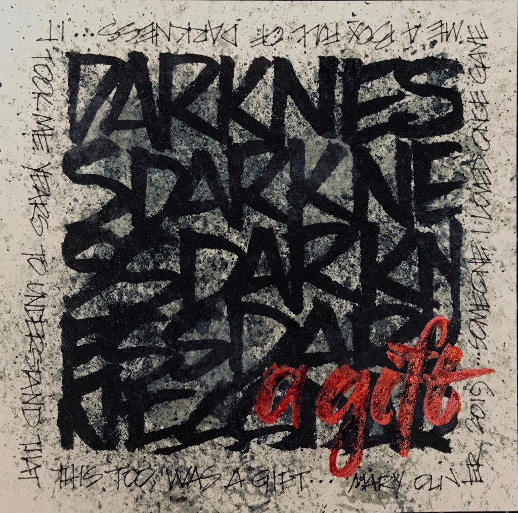 Mary Oliver, a poet and national treasure, was our prompt for week thirty-seven. We were to be inspired by any of her poems or quotes. After reading much of her work, this quote stuck out for me: Someone I loved once gave me a box full of darkness. It took me years to understand that this too, was a gift. I probably created ten versions of this, all with different variations of dark boxes. It wasn’t until I actually wrote the word ‘darkness’ in the shape of a box and muddled it with ink and wet paper towels that I felt I had brought my interpretation to life.