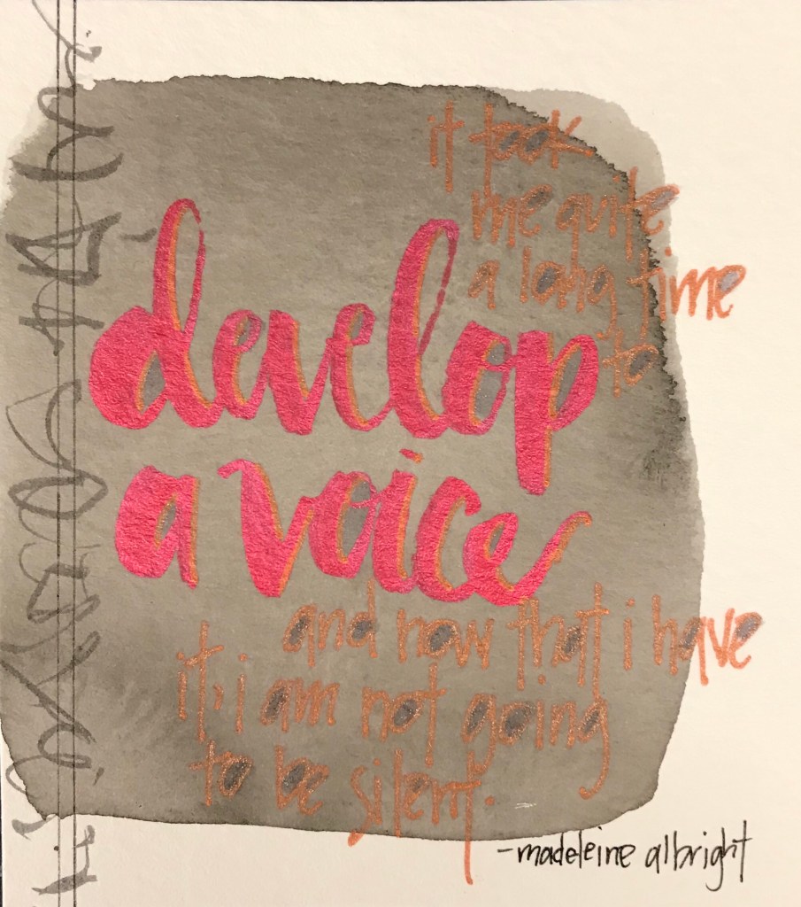 So how did you find your voice? What about your work tells people who you are? Do you stand for excellence, making money, kindness, joy or something else? Would you be blue to describe your voice? Could other people ‘hear’ your voice and know it was you? Maybe you are still searching? Maybe you are still testing the waters and finding what it is you want to say in your work. As Madeleine Albright tells us here, once you find your voice never be silent again.