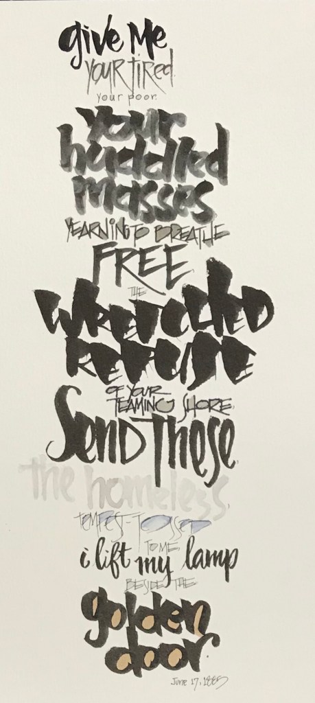 For Week forty-two of our fifty week calligraphy challenge the prompt was indigenous people. I instantly thought about the Statue of Liberty and the words engraved on her base. We all have ancestors who came from some other countries to find a better life here. As I read and reread these words I was reminded of the courage, gumption and trust the people who entered Ellis Island had to make the truck through those doors.