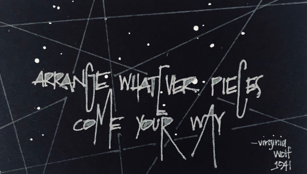 Life comes to us in pieces as Virginia Wolf highlights in her words here. It can be fun and exciting to put all the pieces together to create the grand scheme of things; and it can be frustrating and an unmitigated mess to have to go back and redo things as new pieces are added into the mix. We never know what life is going to dish out so we need to keep an attitude of flexibility and self confidence as the disarray of pieces fall into our lap. We also need to process our own disappointment and put on a happy face when life changes in ways we do not always like.