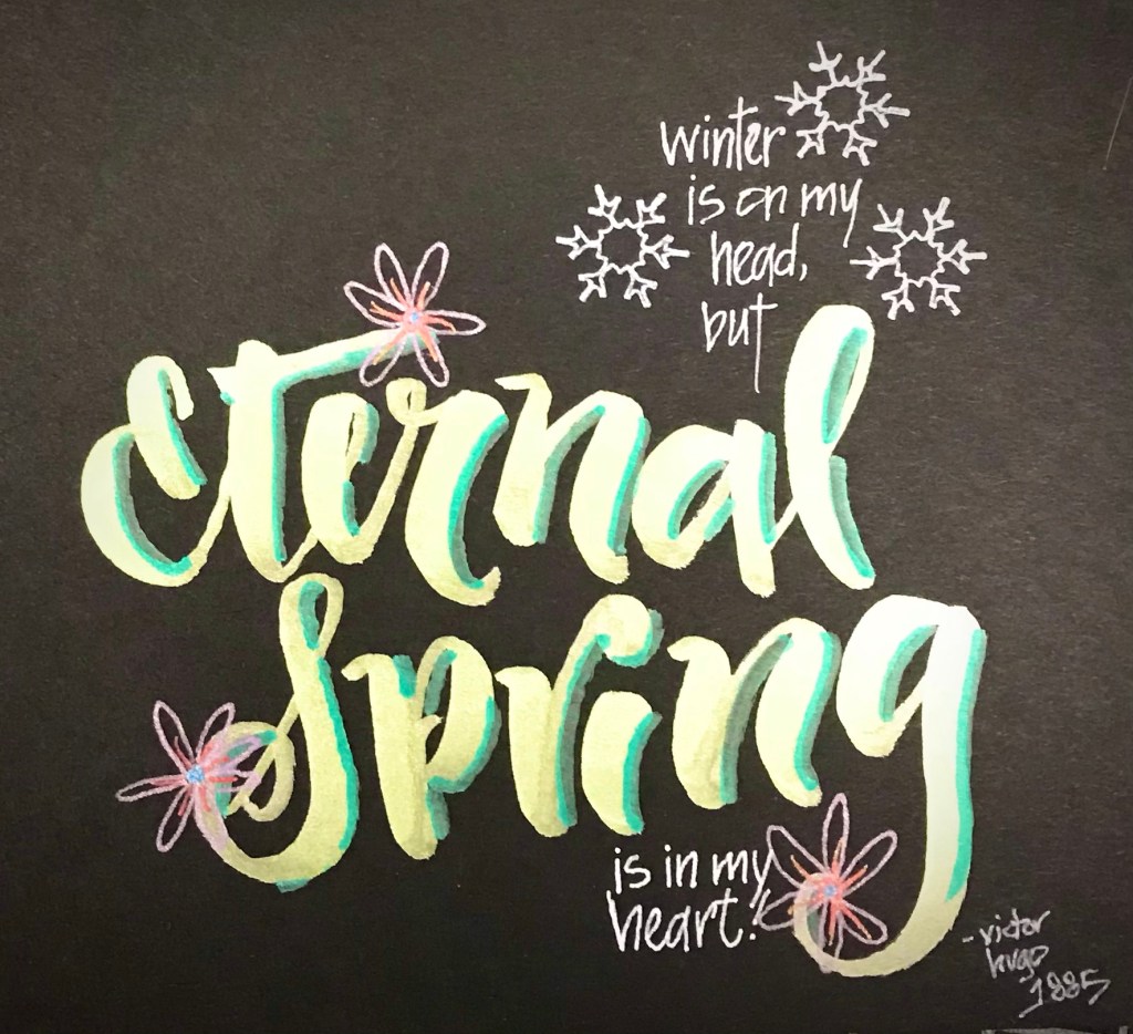 Having grown up outside of Chicago I am a confirmed weather wimp. I no longer care for the deep cold and know that snow is beautiful here because it melts one or two days later. Having live in the South for several decades I am now a huge fan of Spring. Flowers, pollen, trees blossoming, it is incredible. In the Chicago area if you sleep late on the wrong day you would have missed Spring. This quote describes perfectly how we transplanted Northerners feel, Winter may be here but eternal Spring is in our hearts.