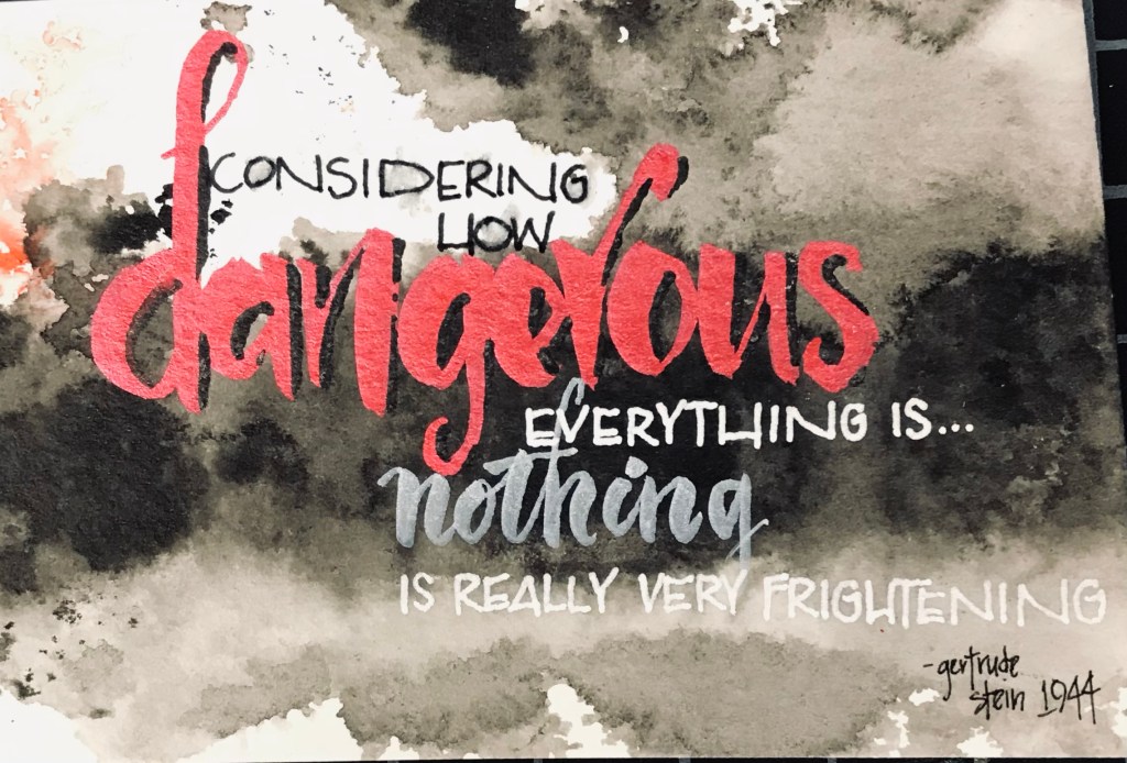 When I read this quote from Gertrude Stein I was reminded that fear and danger are all around us everyday. When may have come to accept or avoid most of it, and yet we cannot avoid everything. Because danger is everywhere we must do some mental gymnastics to live our lives without letting fear control our every thought or move. Those eventually gymnastics prevent us from going crazy or slumping into a corner. Some days it is easier to be limber and active than others. That’s normal in these abnormal days.
