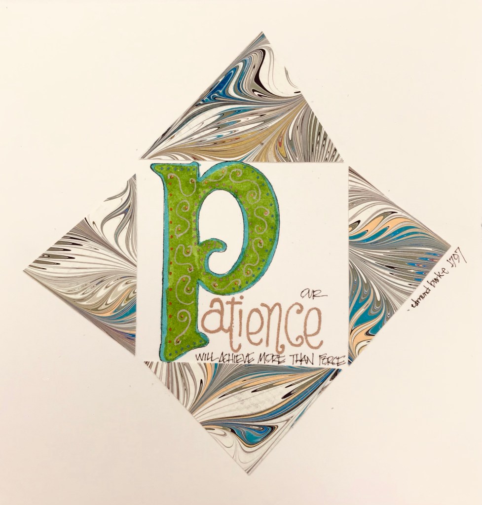 I was working on a piece of art and found myself on my fourth draft. No matter what I tried nothing seemed to be working. I was frustrated, my emotions were running high and my hand seemed to have a mind of it’s own. I took a deep breath and walked away. I know when it’s not working, no matter how I try to force an idea. The more I force it the more frustrated I usually get. I’ve learned to walk away to allow my mind, my emotions and my ideas to rest. It is at these moments when this quote from Edmund Burke comes to life.