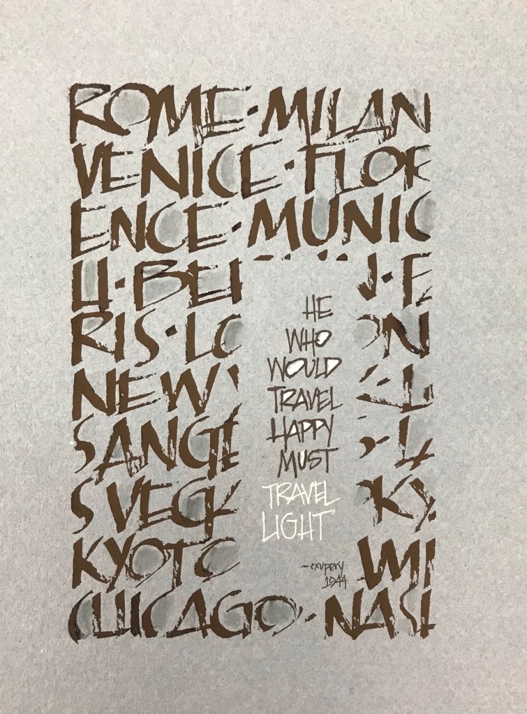 In the early nineties I attended my first international calligraphy conference in Belgium. I was way over my head and severely overpacked. I took a plane, bus, train and car to get to my destination, all the while dragging along way too many art supplies and WAY too much luggage. I don’t know what I was thinking.