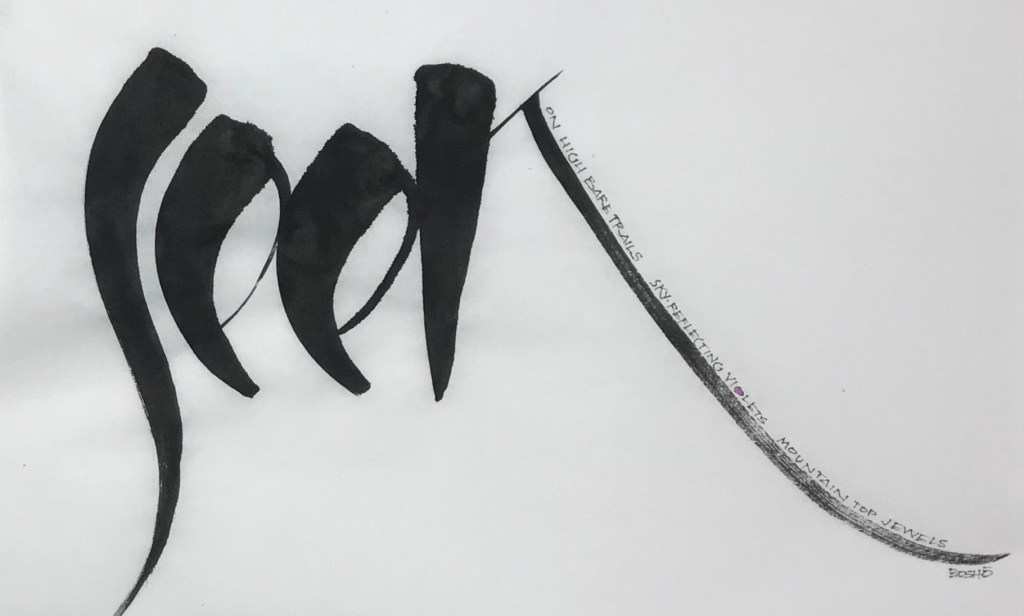 For this challenge we were asked to do anything with the following poem: Seek on high bare trails, sky reflecting violets, mountain top jewels. I created six or seven versions of the idea in my head, all of which I put in my scrap drawer. After over thinking and overworking it I decided to go simple. The poet was an ancient Japanese monk so I channeled my inner Bosho and went with supplies he probably utilized. Sometimes simple is best.