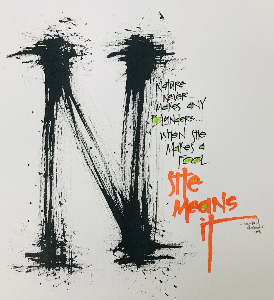 I dipped them in Sumi ink or Asian ‘red’ to write the quote. It was fun testing and trying to make it all look at least a bit like lettering. I wrote the “N” with the bloom and dog ball, the black text with bamboo and the last three words with the succulent pod. Not too shabby if I do say so myself.