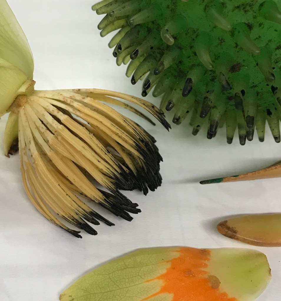 Yet another weekly challenge and this one was to write with a tool from nature. I took a walk and found a few things in our yard – a Tulip poplar bloom, a succulent pod, a scrap piece of bamboo (from a fence I am building), and a dog ball. I took a picture of the items, see below:
