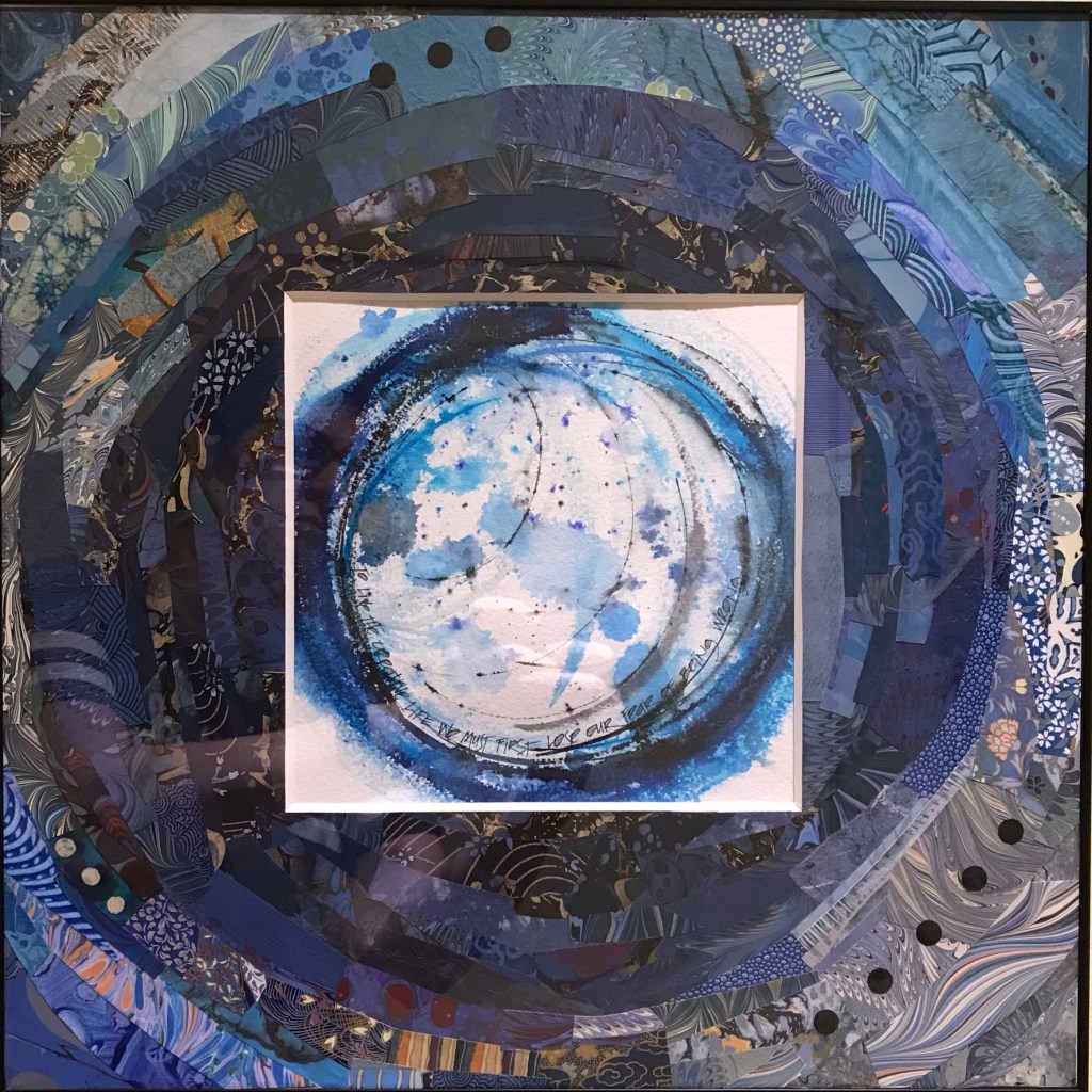 The piece inside the mat also needed to be circular. I did at least a dozen versions of the watercolor and ink background before I landed on this one. The text is a quote from Pablo Picasso, “To live the creative life we must first lose our fear of being wrong.” It is one of my favorite quotes. I chose to add these words to this circular piece as I had to get past many of my fears and frustrations to pull it all together.