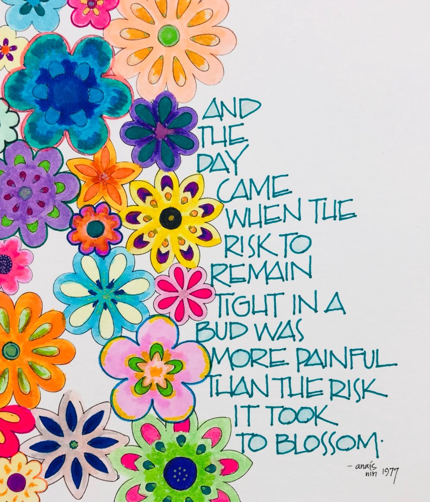 Three years ago I began working from seeds instead of buying plants. It takes longer to build a garden and one must wait several years before the seeds grow full size. However, today I saw the fruits of my labors in a patch of flowers blooming with gusto. It was at this moment that I understood this quote. These beauties fought the good fight – I planted the seeds three years ago – and this week they bloomed full size and bright as the sun. They have spread themselves and now what I thought was a small patch has become a central feature near our front door. It is as if the flowers are reminding me to risk the bloom.