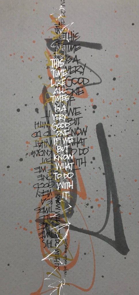 So I stopped and thought about what I could do to salvage the background and mistake. Usually less is more, not in this case. I added the quote multiple times in multiple vertical layouts and let the final white text become the focus. Without realizing it I was practicing what this quote is all about. This is a very good time…if we but know what to do with it.