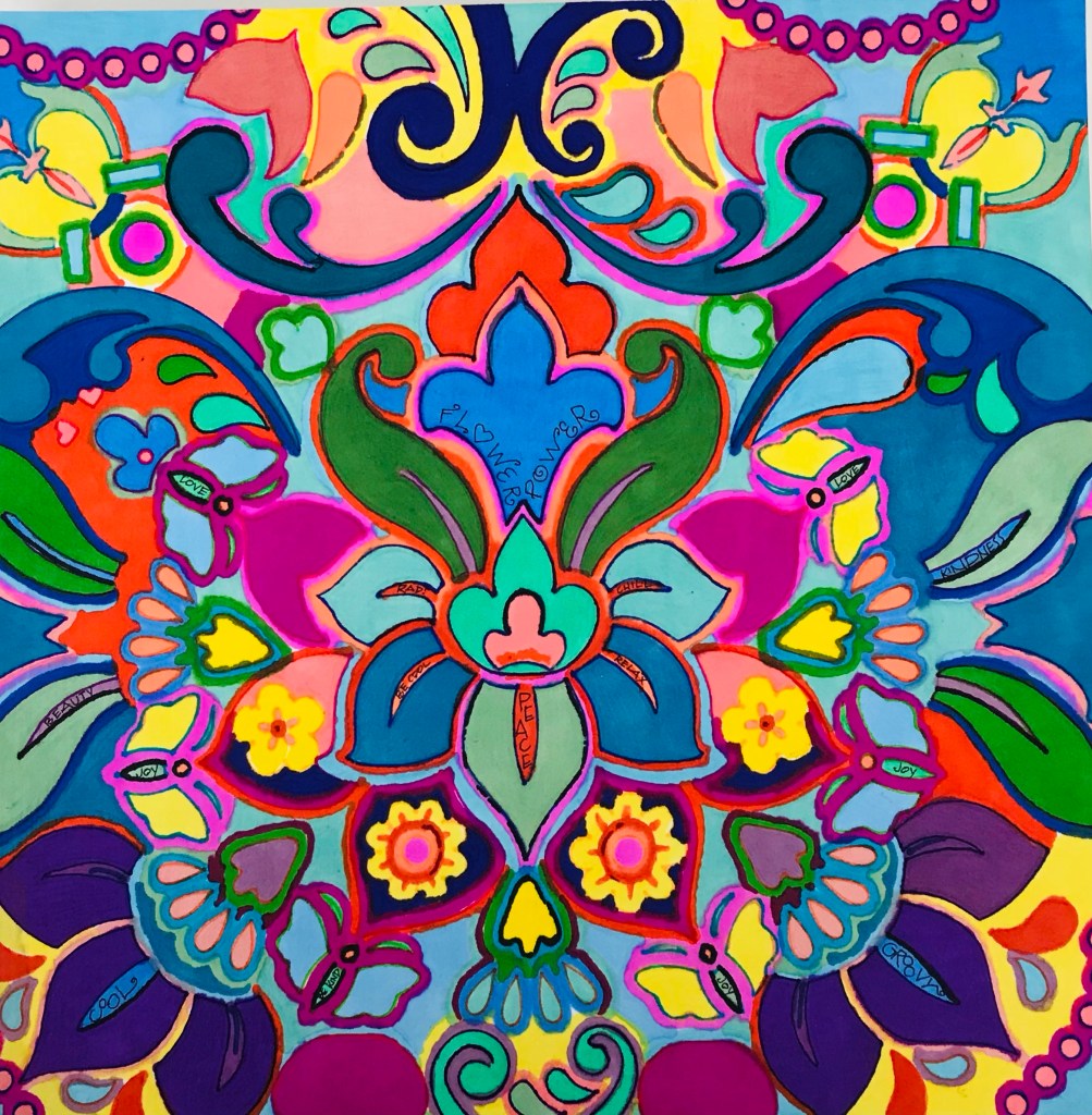 For week twenty-seven of our fifty week challenge the prompt was flowers. I did a piece on flowers a couple days ago, and I considered just posting that piece to fulfill my commitment. Then I thought again. This weekly challenge is about creating new work not about posting something already done. So, I had to come up with something else. I am no illustrator so what to do? All I could think about was ‘flower power’ from the sixties. I had been to the store and walked down the aisles of school supplies, as the kids around here will be going back to school in about a month. I couldn’t resist, I bought a new box of Sharpie markers. I wanted to use them to create something psychedelic and this is what I spent the rainy morning coloring. I used every marker in the box. It was a fun and groovy way to fulfill my commitment. A few catch phrases from the sixties are written very small within the image.
