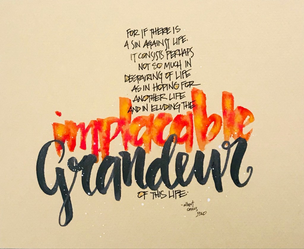 I have many, many books I use to find quotes. I prefer books to searching online as I like trudging through the pages to discover unknown authors, words, and I am always pleasantly surprised by what the next page holds. Today I learned a new word “implacable”. When I read this quote I had to look it up. It means unstoppable or relentless. Once I read the definition I knew I had to calligraphy these words.