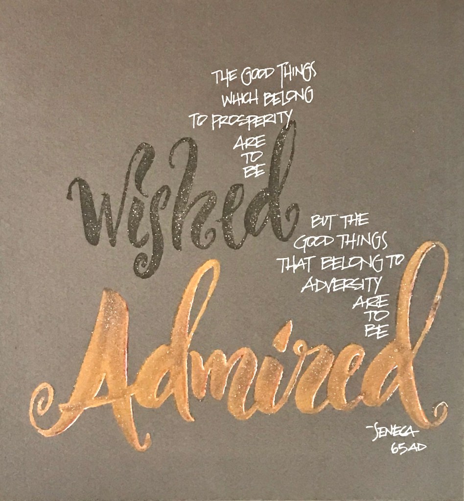 As Seneca reminds us here, the good things we gain through prosperity are usually things that we wish about. The good things we learn and gain through adversity are the true gifts that we need to admire. Anyone can show character, integrity, honesty and joy during the good times. That’s easy. When life is going your way everything seems better. It is how we behave and what we learn during times of adversity that tell the truth about our character.