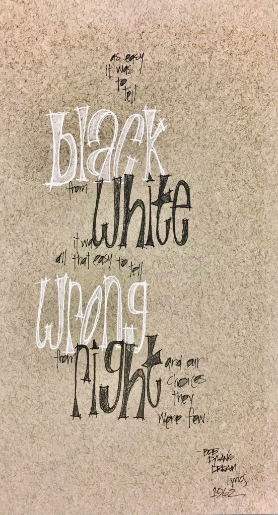 For week thirty-four of our calligraphy challenge we were asked to be inspired by Bob Dylan lyrics. I knew his typical songs, so I wanted to find one I did not know. He wrote this song Bob Dylan’s Dream in 1962. I had never heard it and was struck by the black and white, wrong and right references. I wanted to write it as if Dylan may have sketched it out for his producer or other artists. I wanted to play on ‘right’ and ‘white’ with black ink instead of the expected white.