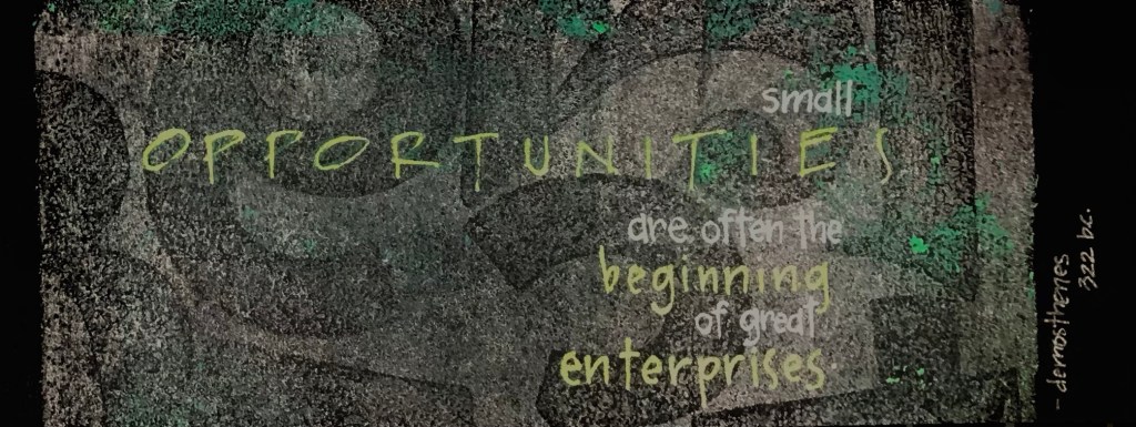So today I encourage you to stop and think about that small opportunity you face. Give it a moment and ponder what could be. Just because it’s small does not mean it is worthless or unimportant. Big ideas start as small ones, they just need to be encouraged and fertilized to get the growth going. Be willing to stop, look and think. YOUR next thing may be right in front of you too small to grab your attention; slow down, give it a thought and see the opportunity in that one small thing.