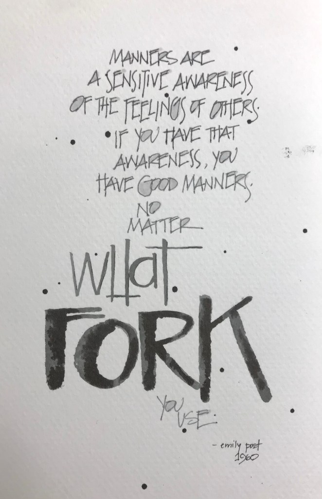 I was in a drive through ordering breakfast, and I said “Thank You” into the microphone then drove around. The woman at the window commented on my manners. She told me she rarely hears anyone say “Thank You” after she gives them their total. She thanked me for making her morning better. It was at that moment that I knew this Emily Post quote had to go with this story.