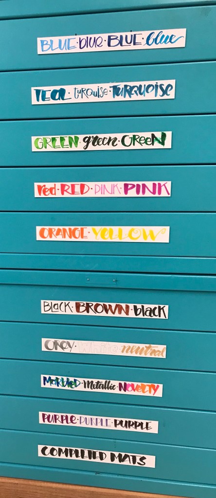 For week thirty-eight of our fifty week challenge we were asked to map it out. Take some time to review the areas of your studio / work spaces and map it to make it better work for your creative style. Several years ago we found four sets of flat files at an estate auction. They were that ugly industrial beige, so I painted them Teal and then added a work top. This is now where I store all my handmade papers from across the globe, and it serves as a fabulous work island in the middle of my studio. To help keep things organized I made labels for each drawer by color then attached them to the metal drawer with magnetic tape.