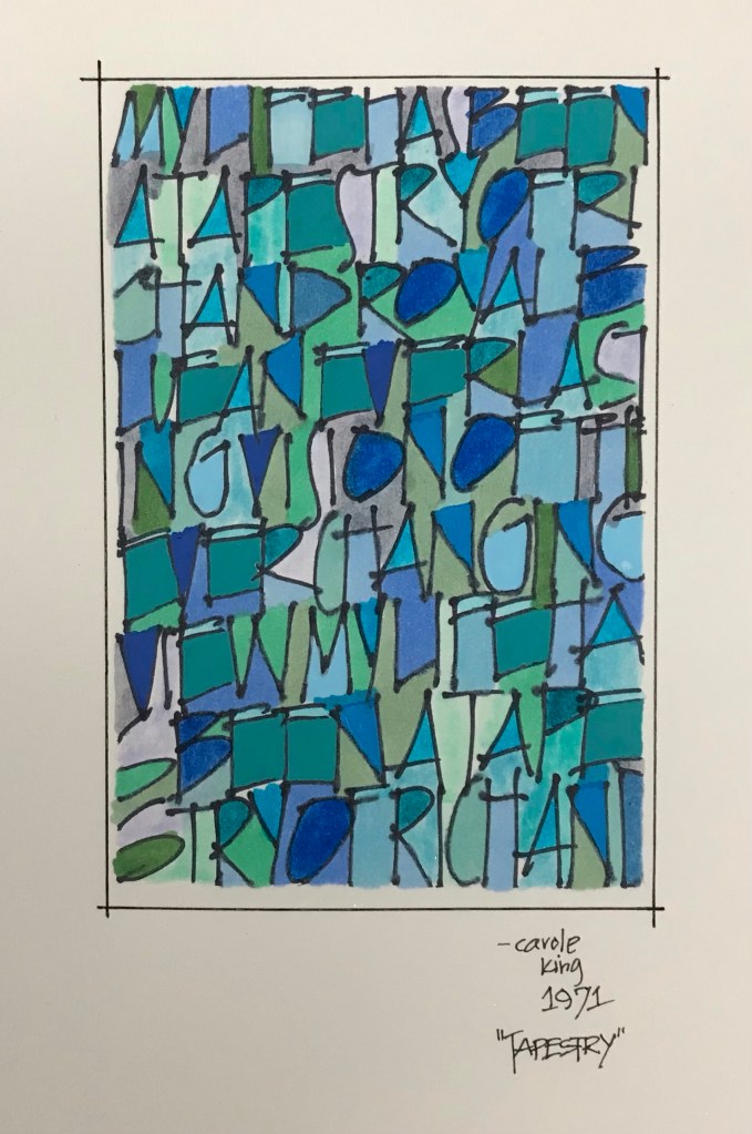 It was her breakthrough album in 1971. It topped the charts and most of the songs on the album became hits and covers that are replayed and remade to this day. Carole King was a fabulous song writer who knew how to put words together to emit emotions, spark our imagination and describe the pictures in our heads. This Verse from the song tapestry, also the album title, reads as: