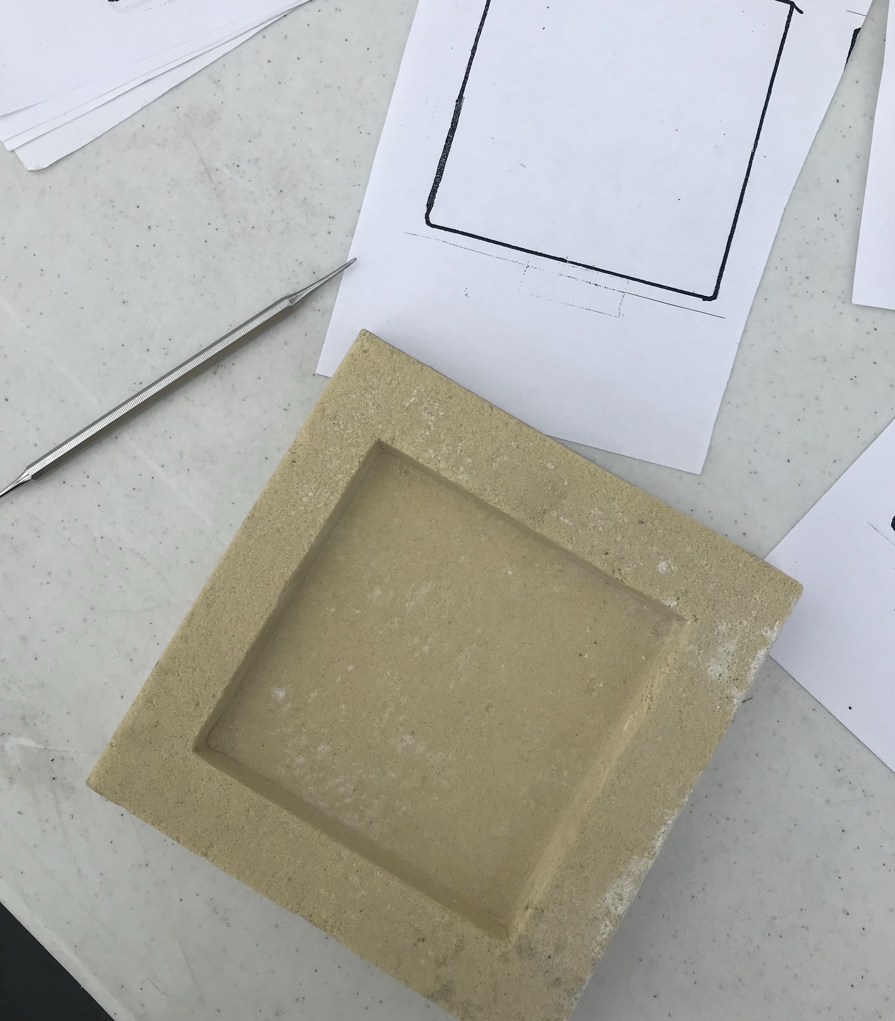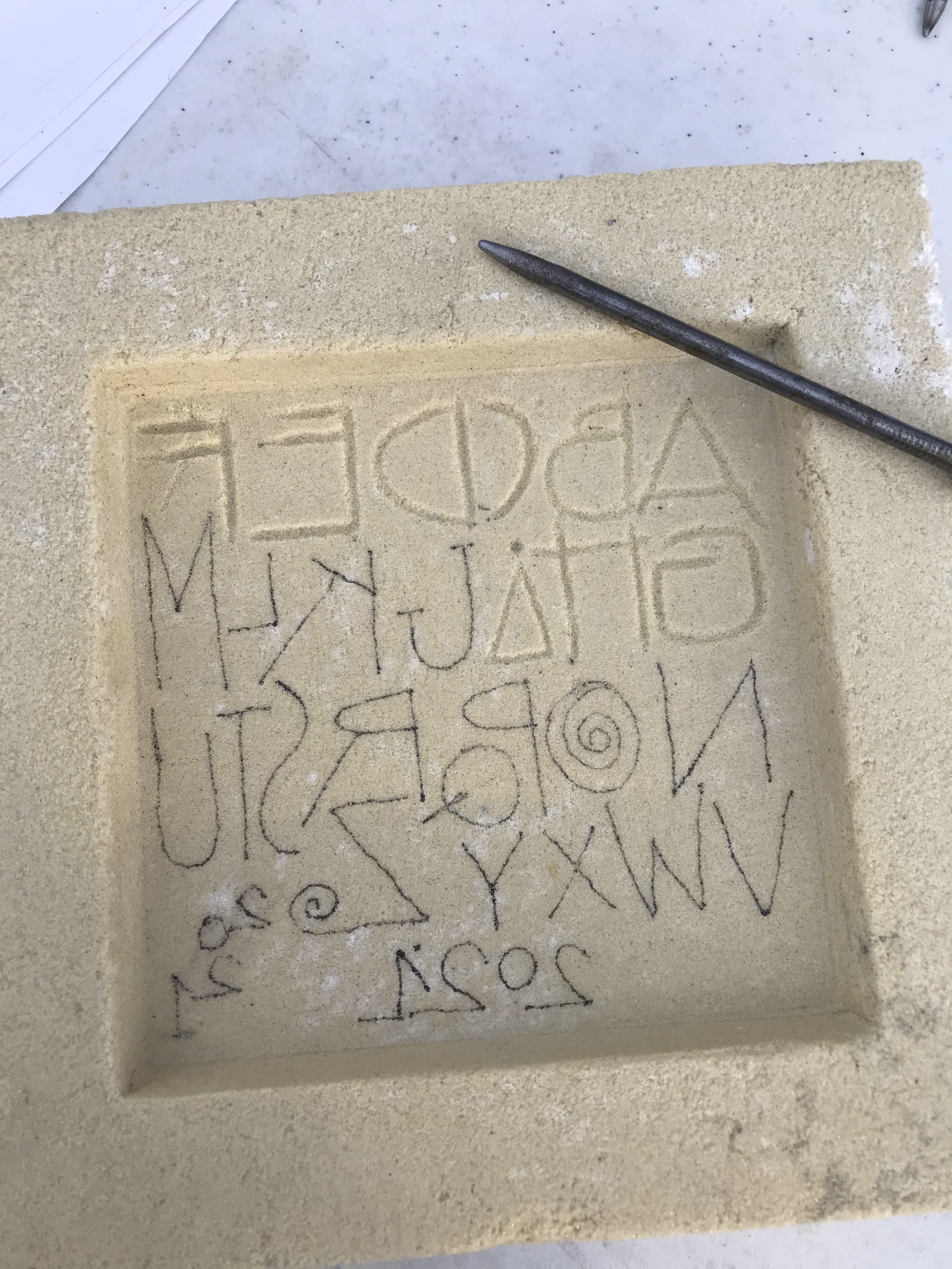 Step 1: A square mold made of sand, water and resin is used as the base for the tile. The letters or image needs to be reversed as it will appear in it’s opposite format once the tile is cast.