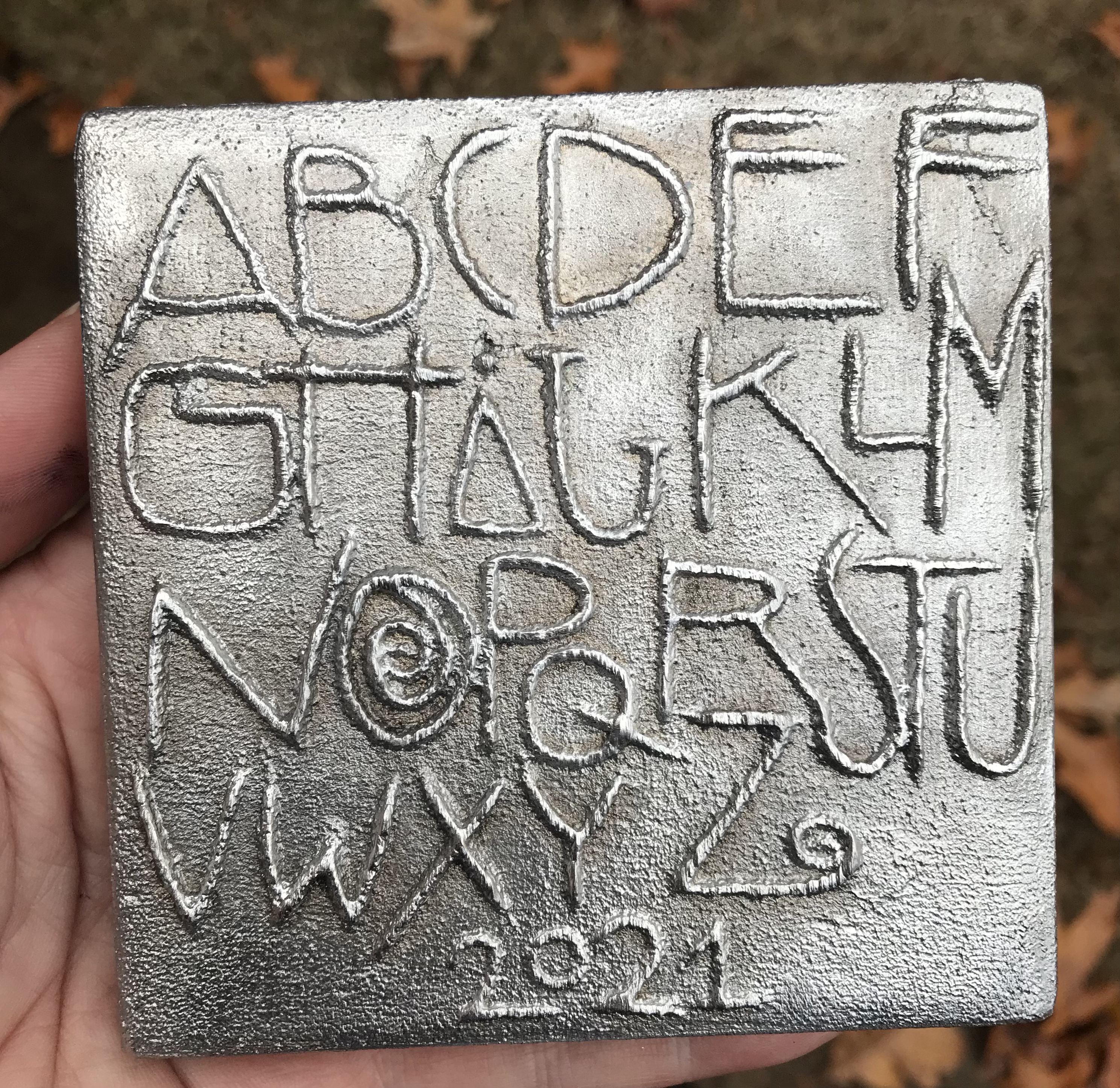 For week forty-eight of our fifty week calligraphy challenge we were asked to write letters A-Z any way we wanted. I was a bit bored by the prompt, so I was trying to think of something different to do. Several days later we were in Memphis, TN and stumbled upon the Metal Museum (www.metalmuseum.org) and walked into a tent where they were making casting aluminum tiles. BING! Challenge accepted! I sat down and got busy.