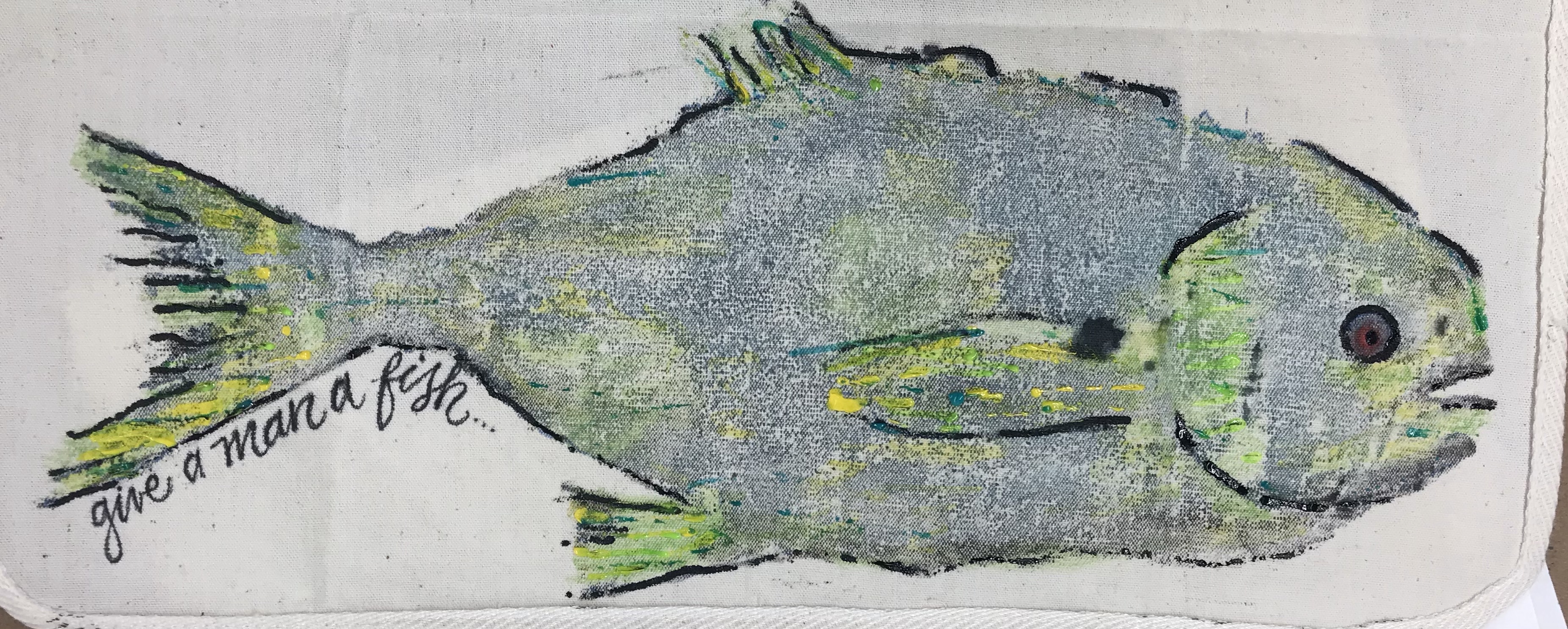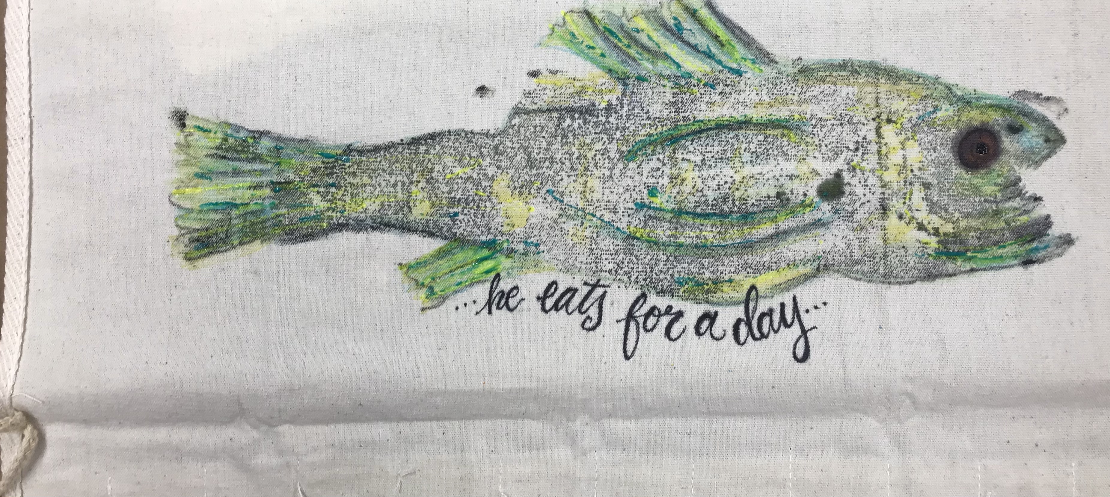 For week forty-seven in our fifty week challenge we were asked to decorate a bag. I instantly thought of decorating a paper bag for Christmas but that seemed too obvious. I hunted around my studio and found this ‘test’ canvas pen holder. We printed a Bronzino and a Red Snapper using Gyotaku techniques (the art of Japanese fish printing) to decorate the front and inside flaps. I then added the final part of the quote on the inside, one word per pen insert. For a test piece it turned out okay.