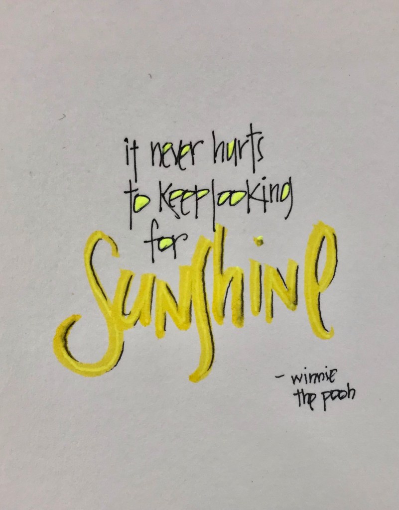 For the final prompt in our fifty week challenge we were asked to create something utilizing the wisdom of Winnie the Pooh. I found this quote and had great ideas about bright sunbeams, colorful reflections and then it hit me. The words uttered by this willy old, silly old bear are most charming because of their simplicity. Which meant no matter how elaborate my idea it could in no way enhance the meaning behind these words. So I went simple and found myself more pleased than I realized. Thank you Pooh.