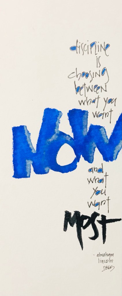 Maybe that is one of the reasons I love these words. Every day we are challenged to practice discipline not just a couple days into a new year. Each moment of our lives new chances, new opportunities to do something other than the path we have decided to follow crop up and tempt us towards a better option. Abraham Lincoln was right, discipline is choosing between NOW and MOST. Discipline is staying the course or altering the method to reach the end instead of being tempted by the fresh, new, shiny thing that presents itself. There will always be something better, smarter, faster, more sexy, more practical than the thing we want most. The challenge is in making the choice each day for the long term MOST rather than the short term NOW.