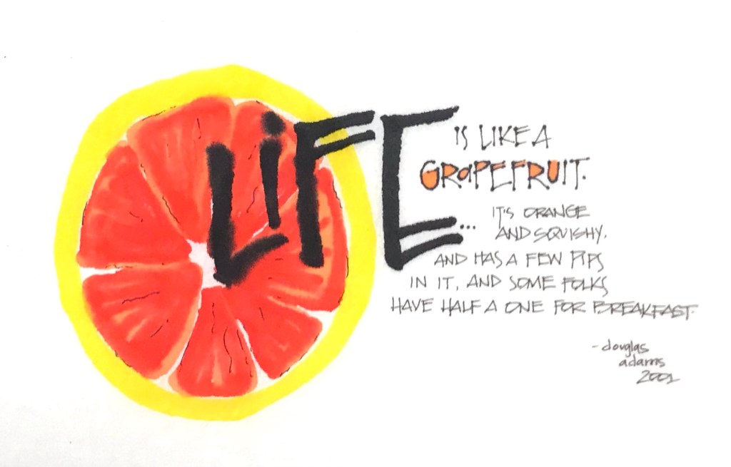 I was rearranging my studio work space and found a pad of Japanese rice paper I bought in Tokyo. It was like a patient friend waiting for me to come and visit. I pulled out a couple pages and began to play with ink. I then opened one of my many quote books and found this fun quote, which made me wonder how I would draw a grapefruit half with ink that bleeds and spreads. I had fun experimenting and renewed my love for really good rice paper.