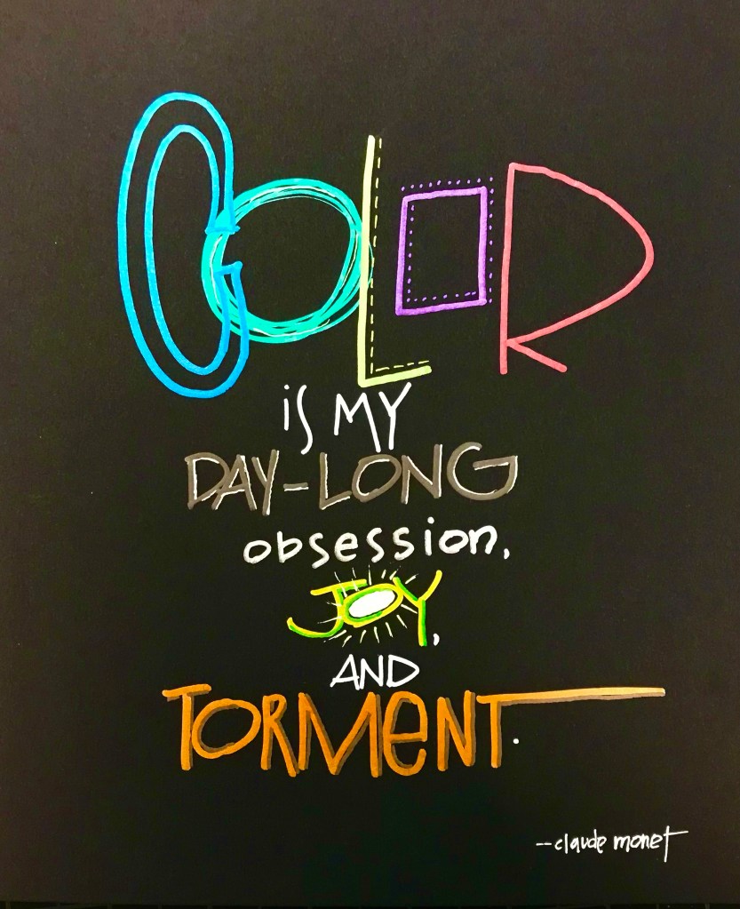 I read this quote and was struck that Monet would use such adjectives to describe something for which he was a master. He used color and light in a new way, inventive ways, transformative ways AND to then know that color was both his joy and his torment was enlightening. It made me feel better about my own up and down creative days in my studio.