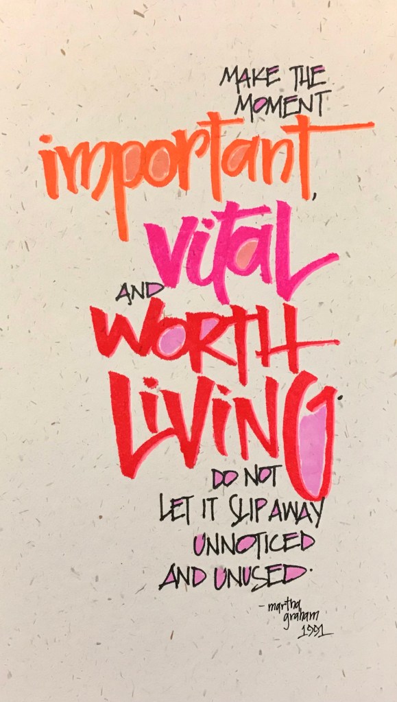 She was a modern dancer and choreographer who had a style that changed dance forever. She taught for over seventy years and her technique reshaped modern dance, so much so that it is still being taught today. Martha Graham reminds us in these words that every moment, EVERY moment is worth it. If we are not careful they slip away unnoticed and unused.
