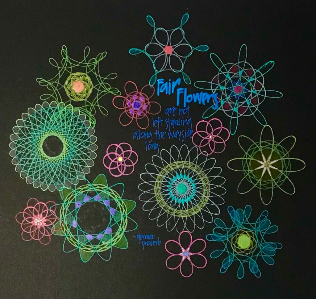 Remember what it was like when as a child you got a new toy? You wanted to play with it non-stop, imagining incredible things and whiling away the hours using your pretend ideas to have fun and feel joy. I did that same thing with my Spirograph tools. I had fun making flowers and circles, figuring out which wheel made what shape, then coloring them in to add more life. Once I had filled the page I then had to find a quote to pair with all that fun.