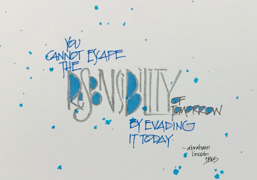 Good ole Abe reminding us that putting things off does not make them go away. I type this as I am waiting on a family member who is getting a routine medical procedure, one we all put off. It’s no fun taking care of ourselves all the time. Sometimes we just want to do and eat, indulge and enjoy whatever we want. Doing that too often and too long eventually catches up with us. When we neglect our mental and physical health we face our own poor choices somewhere down the road.
